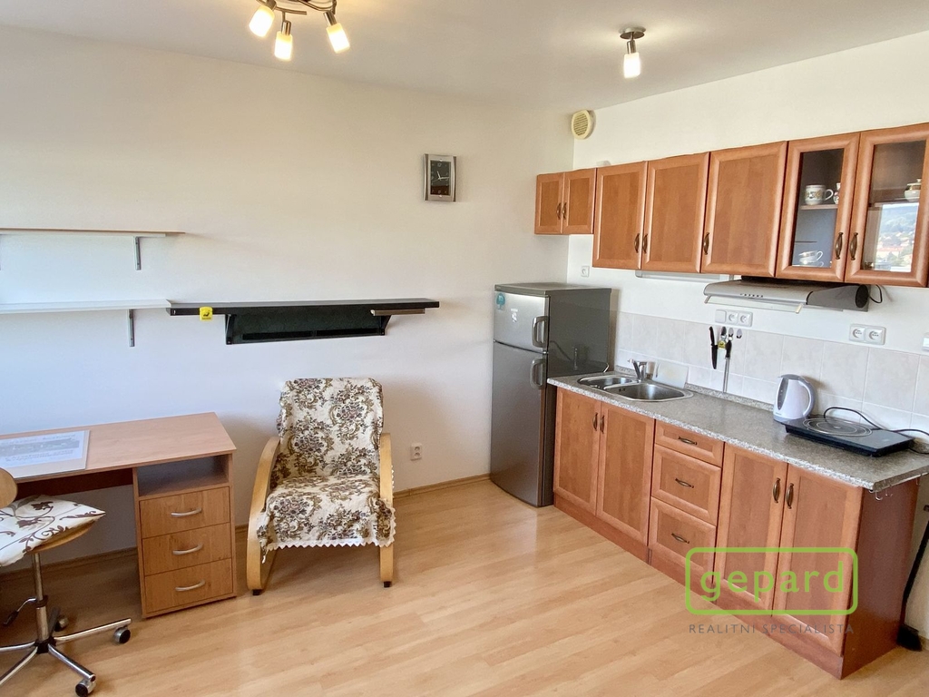 Představujeme na pronájem bytovou jednotku o velikosti 1+kk s komorou, která se nachází v klidné části města Mníšku pod Brdy, v ulici Ke škole. Bytová jednotka se nachází ve 3.patře se severozápadní orientací a svou dispozicí nabídne vstupní chodbu s vestavěnou skříní, obývací pokoj s kuchyňskou částí, koupelnu se sprchovým koutem, toaletou + bude k dispozici nová pračka. V obývacím pokoji je umístěná jednolůžková postel, šatní skříň, komoda a psací stůl. V celém bytě je plovoucí laminátová podlaha, v koupelně pak dlažba. Okna jsou dřevěná třívrstvá, topení – centrální plynové.