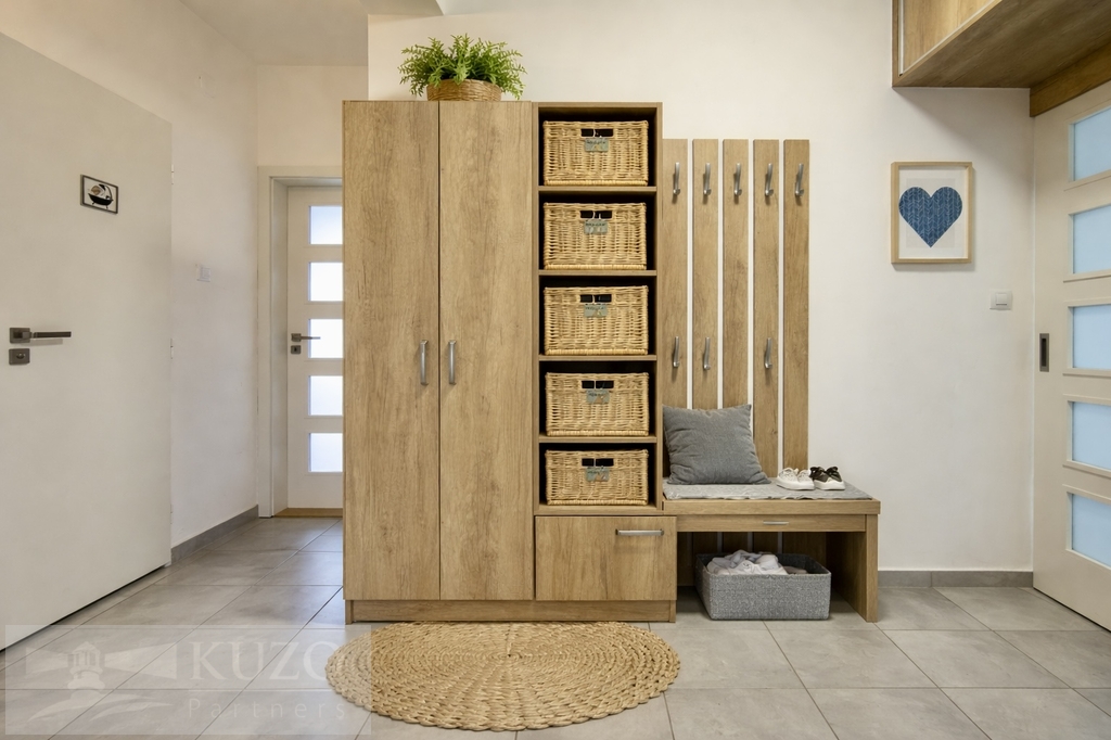 Byt se nachází v prvním podlaží, jedná se o zvýšené přízemí, a hlavní obytné místnosti jsou orientovány na východ a západ. Součástí prodeje jsou vestavěné skříně v předsíni a koupelně a kompletní kuchyňská linka včetně spotřebičů, konkrétně myčky, lednice, pračky, trouby a indukční varné desky, digestoře.