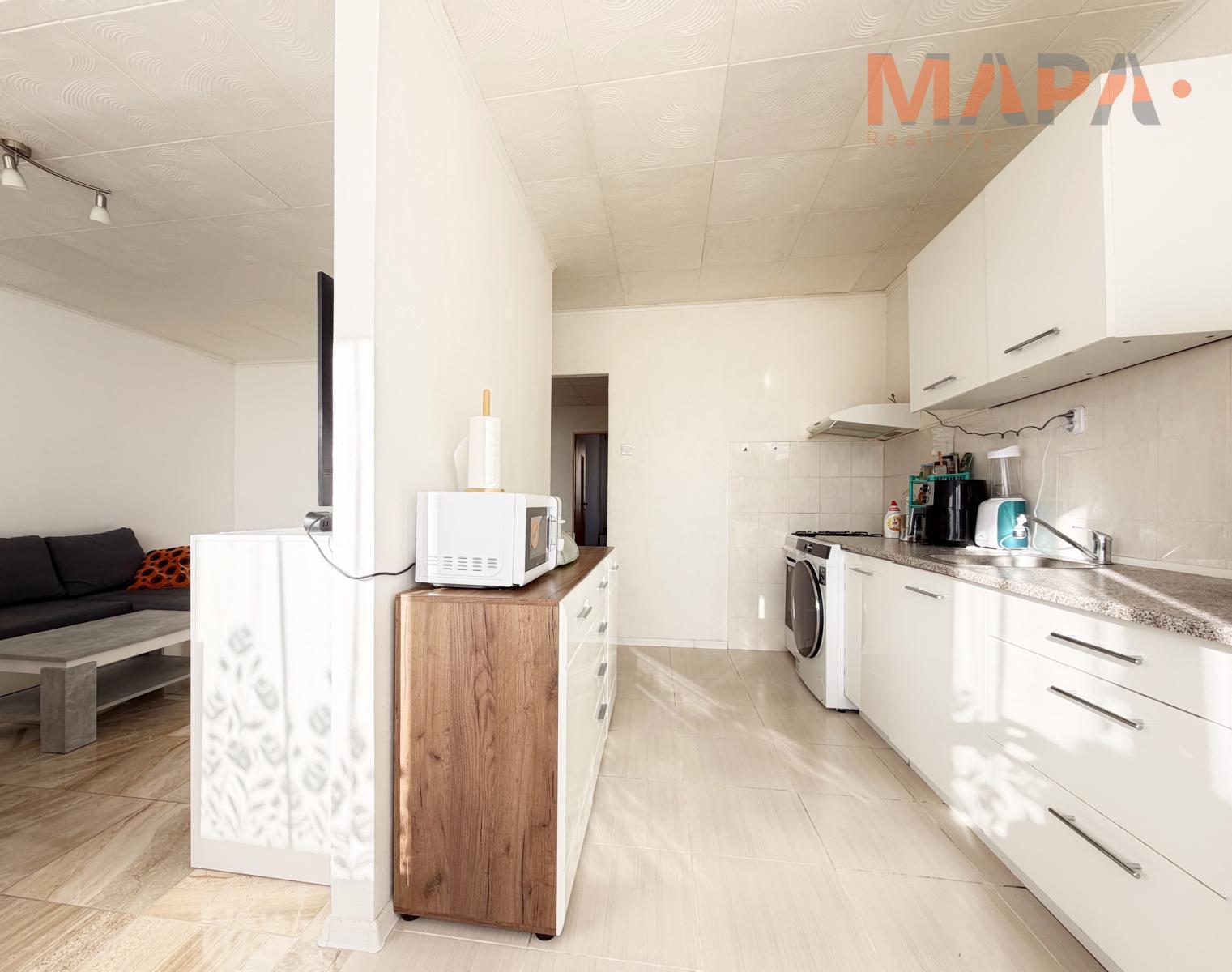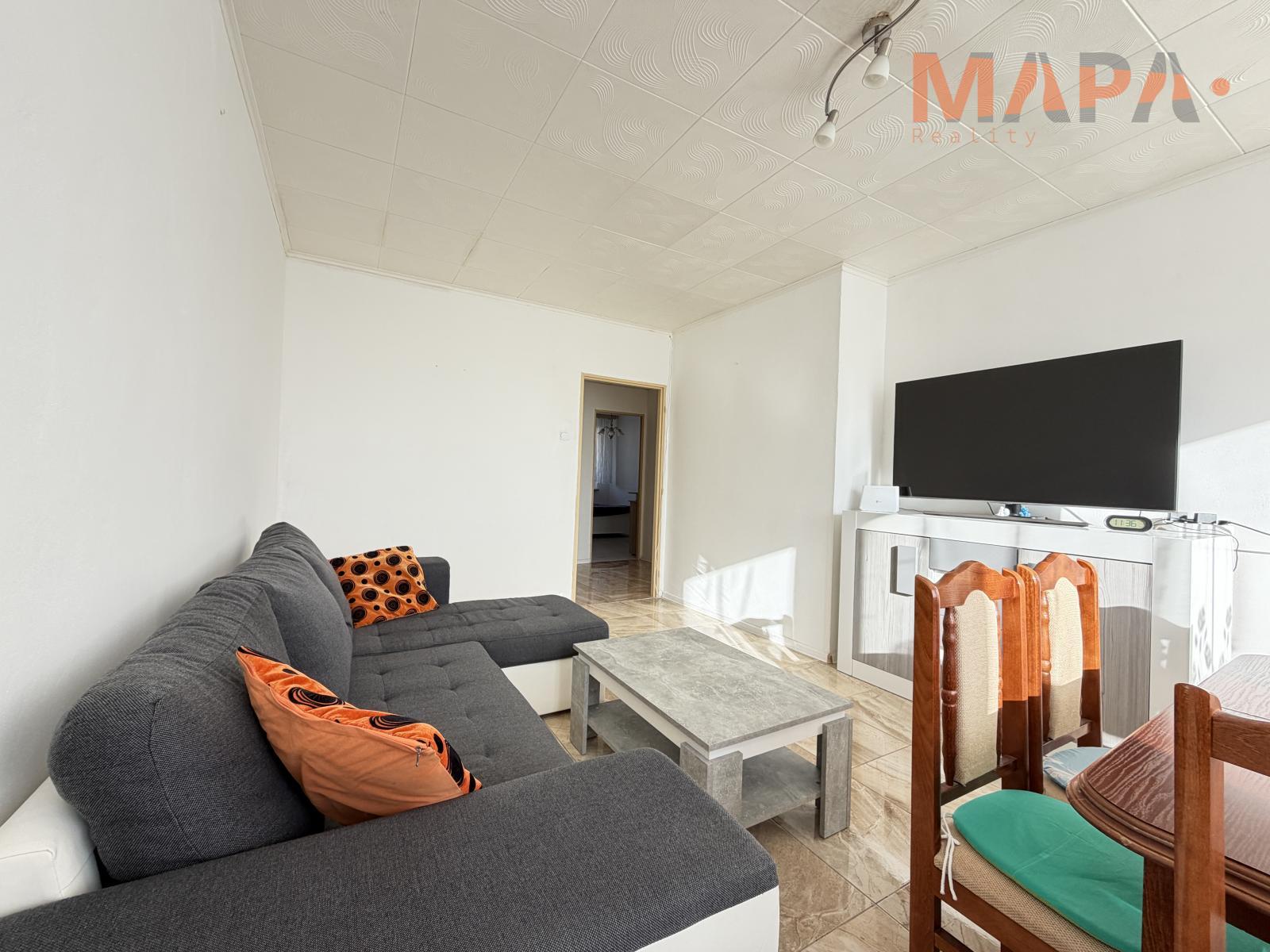 V bytě je útulná a moderně zařízená kuchyň s příjemným jídelním koutem. V obývacím pokoji můžete relaxovat po náročném dni a vychutnat si společné chvíle s rodinou nebo přáteli. Dva pokoje přístupné z chodby nabízejí dostatek soukromí a klidu pro odpočinek. Jeden pokoj může sloužit jako pracovna nebo dětský pokoj a druhý ložnice.
