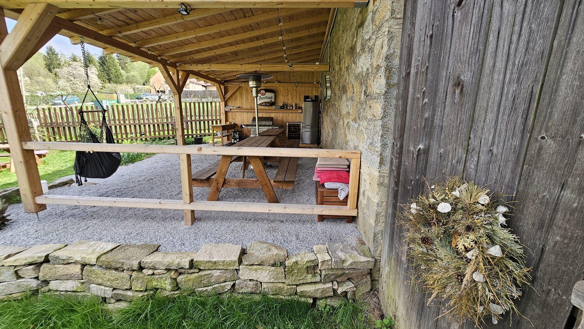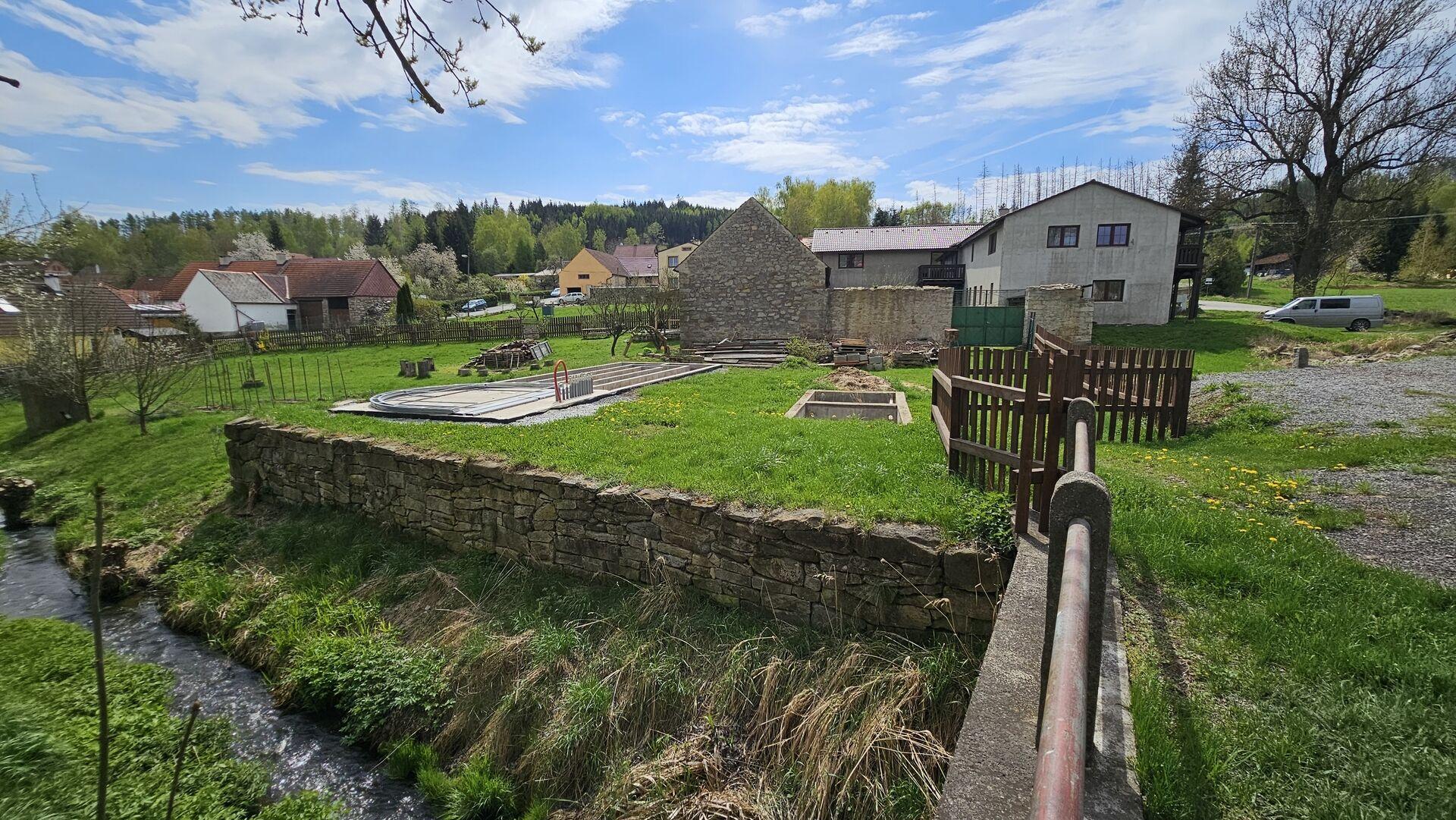 Novostavba domu spolu s dvorem a stodolou tvoří parcelu typu zastavěná plocha a nádvoří. Před domem byla zahájena stavba vyhřívaného skleníku, která by využívala teplo ze systému fotovoltaických panelů, se kterými je uvažováno v tech. přípravě ohřevu vody ze soustavy ústředního topení. Jako další zdroj tepla je využíván krb s výměníkem. Celý pozemek je nově oplocen. V zahradě nová krytá masivní pergola s venk. kuchyní, pípou a grilem.