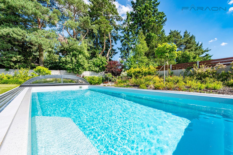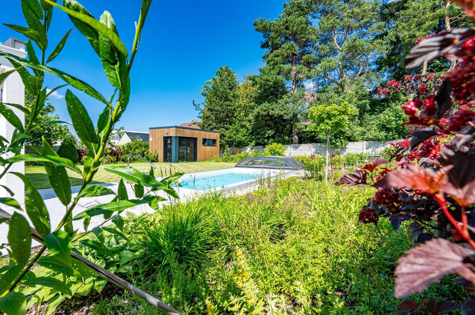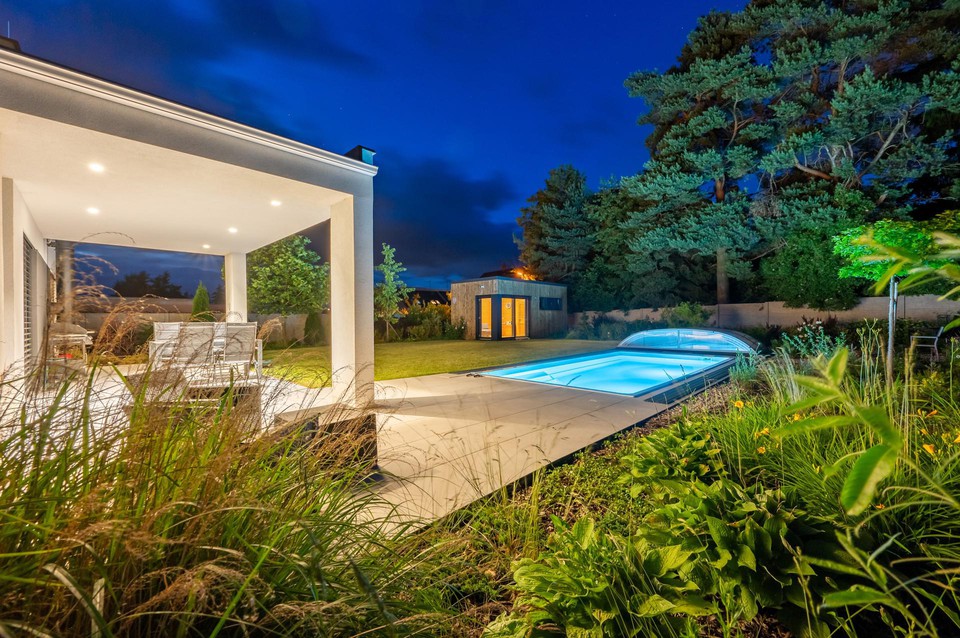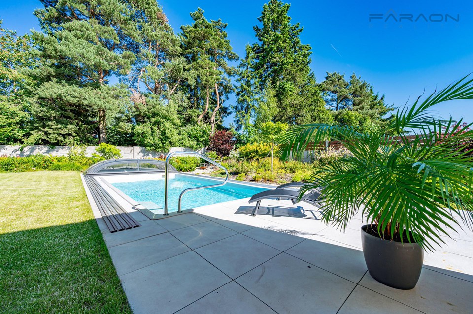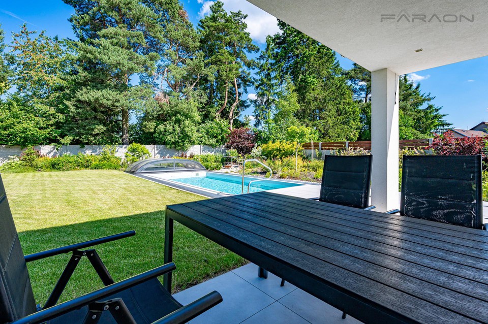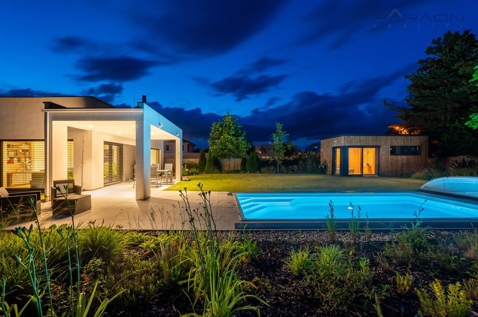 Prodej moderní, pasivní a vzdušné dřevostavby - novostavby (A) 3kk obklopené krásnou, udržovanou zahradou s bazénem, vytápěné tepelným čerpadlem, včetně vyhřívání zastřešeného bazénu (7,2 x 3,4 m) se slanou vodou a protiproudem, splňuje veškeré nároky na bydlení vyššího standardu v přírodě s nízkými provozními náklady, a to v luxusním jednopodlažním domě s rekuperací vzduchu. Dům nabízí vzdušný a slunný interiér na krásném, rovinatém a slunném pozemku o velikosti 1 132 m² v klidné rezidenční části obce Mukařov – Srbín nedaleko Říčan, pouhých 20 km od Prahy. Pozemek zahrnuje upravenou zahradu s automatickým zavlažováním. Pozemek zahrnuje upravenou zahradu s automatickým zavlažováním a designový zahradní domek se sociálním zařízením (koupelna, toaleta), samostatným pokojem a technickou místností (sklad), vše lemováno vzrostlou zelení, zděným plotem a hliníkovými lamelami, které zajišťují maximální nerušené soukromí a zároveň pocit intimity a ničím nerušeného klidu.