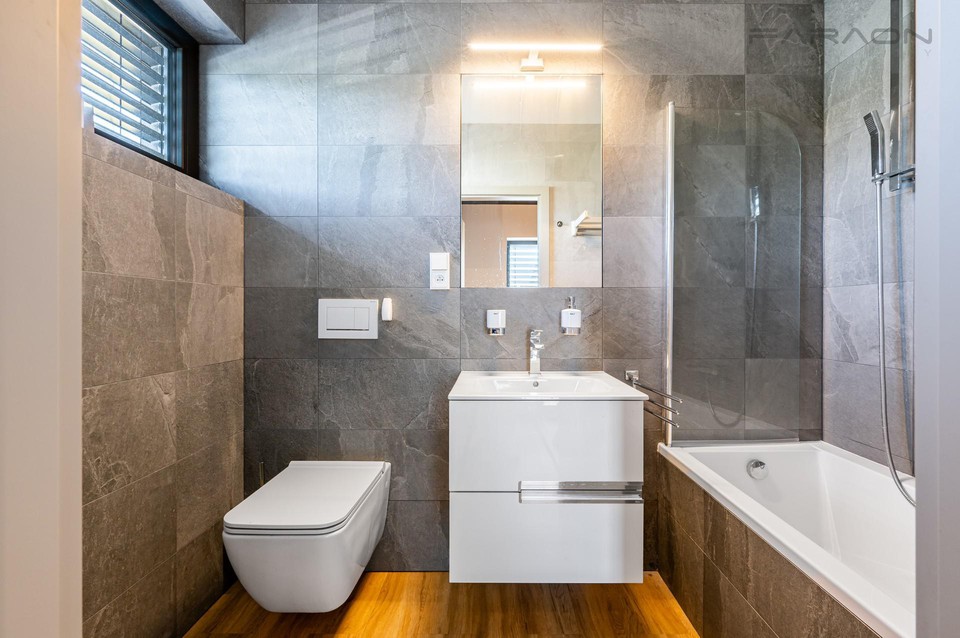 Velkoformátová okna s izolačními trojskly propouštějí dostatek přirozeného světla a jsou vybavena exteriérovými lamelovými žaluziemi na dálkové ovládání. Podlahy jsou vinylové, v koupelnách je podlahové vytápění s velkoformátovou dlažbou.