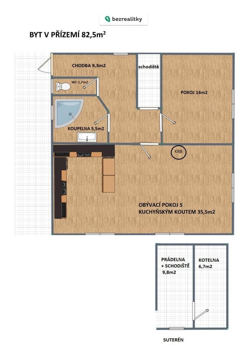 o Přízemí: 2+kk 82,5 m² s prádelnou a kotelnou, po rekonstrukci v roce 2021