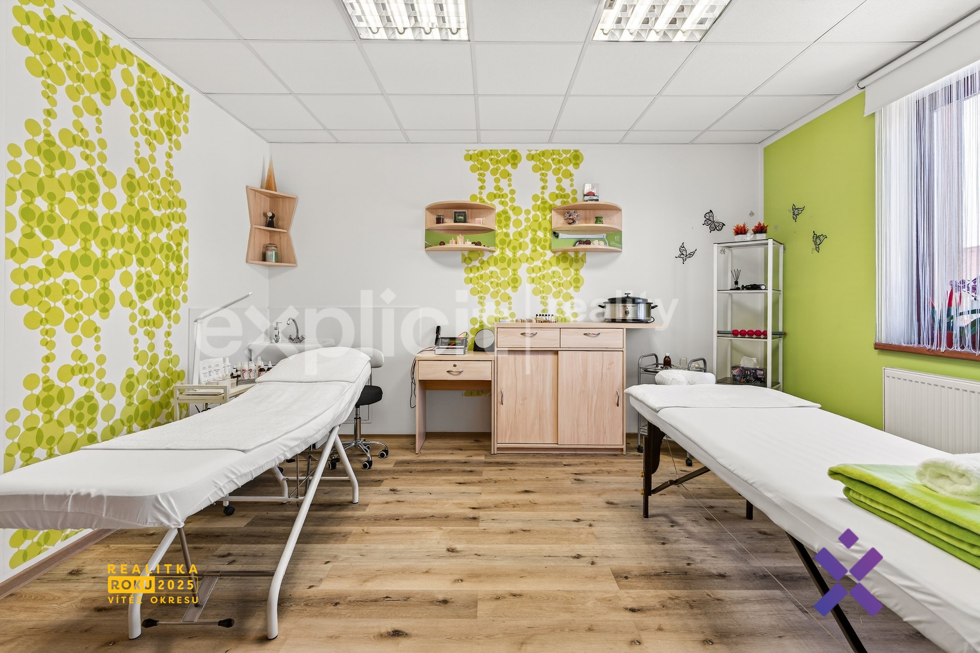 Nebytová část má vlastní samostatný vstup a zároveň je propojená s obytnou částí domu, což otevírá široké možnosti využití. Dispozice zahrnuje 2 samostatné místnosti, menší kuchyňku a toaletu. Prostor je aktuálně využíván pro masáže a kosmetické služby a je připravený k okamžitému podnikání. Zároveň nabízí potenciál pro úpravu na samostatnou bytovou jednotku k pronájmu nebo přizpůsobení dle vlastních potřeb.