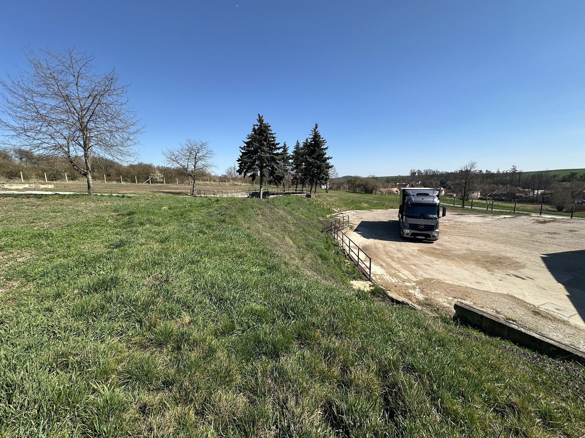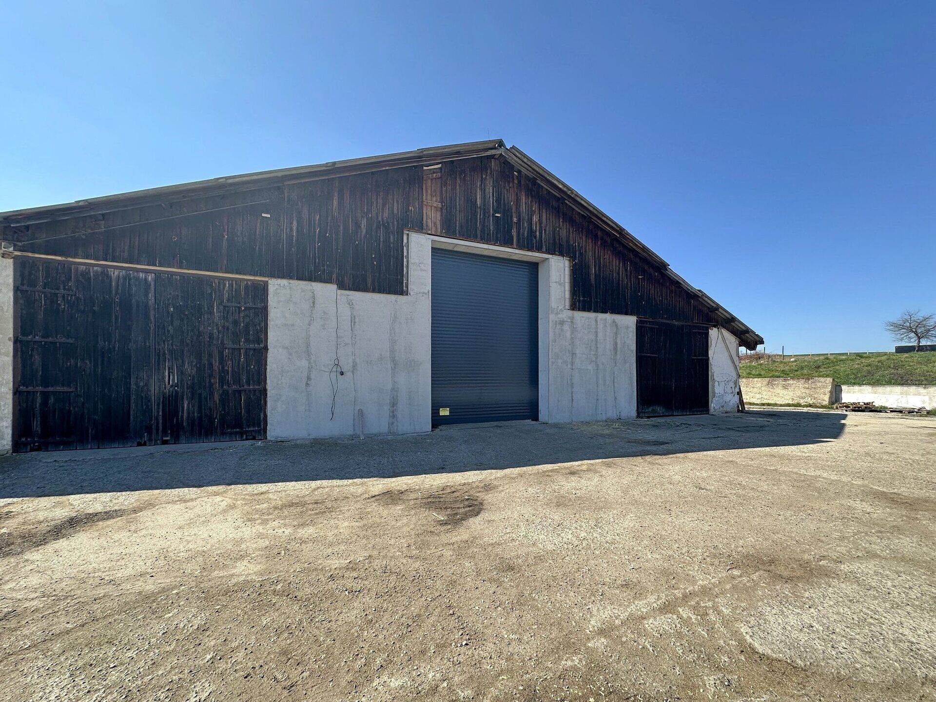 Prodáme vyčištěný zemědělský areál, nyní užívaný pro skladování. Na rozlehlých pozemcích se nachází funkční skladová hala o zastavěné ploše 1.833 m2, betonové základy pro halu 60 x 18 m, betonová skladovací plocha o ploše cca 2.000 m2, jímka na vodu, požární nádrž, betonové areálové komunikace a volné pozemky. Pozemky areálu činí celkem cca 20.000 m2 (na plánku obě modře i červeně vyznačené části dohromady).