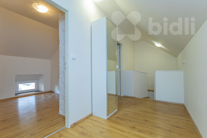 Z předsíně se pokračuje do kuchyňského koutu s útulným prostorem pro jídelní stůl či posezení. Schodiště vede do patra, kde chodba odděluje dva samostatné pokoje, vhodné jako ložnice, dětský pokoj či pracovna.