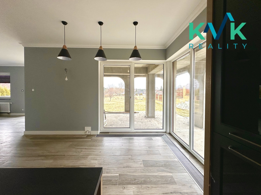 Dominantou přízemí je velkorysý obývací prostor s francouzskými okny. Je zde také připraven komín na krb. Tento společenský prostor plynule navazuje na moderní kuchyň. Ta je vyrobena na zakázku v Německu a je plně vybavena vestavěnými spotřebiči. Celá tato společenská část domu má přímý vstup na terasu.