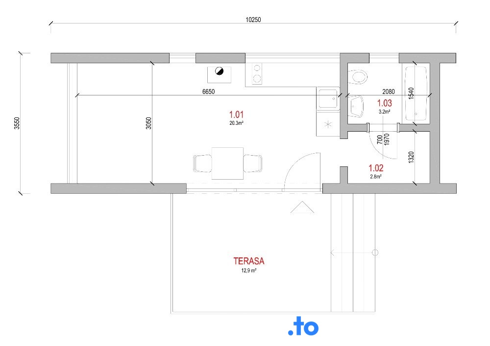 Dům na klíč má dispozici 2+kk s obytnou plochou 26,6 m2 a terasou o velikosti 12,9 m2. Najdete v