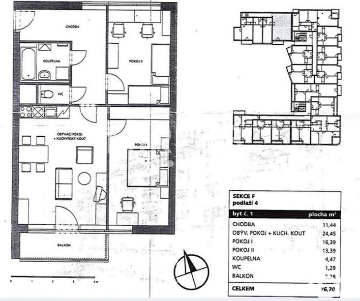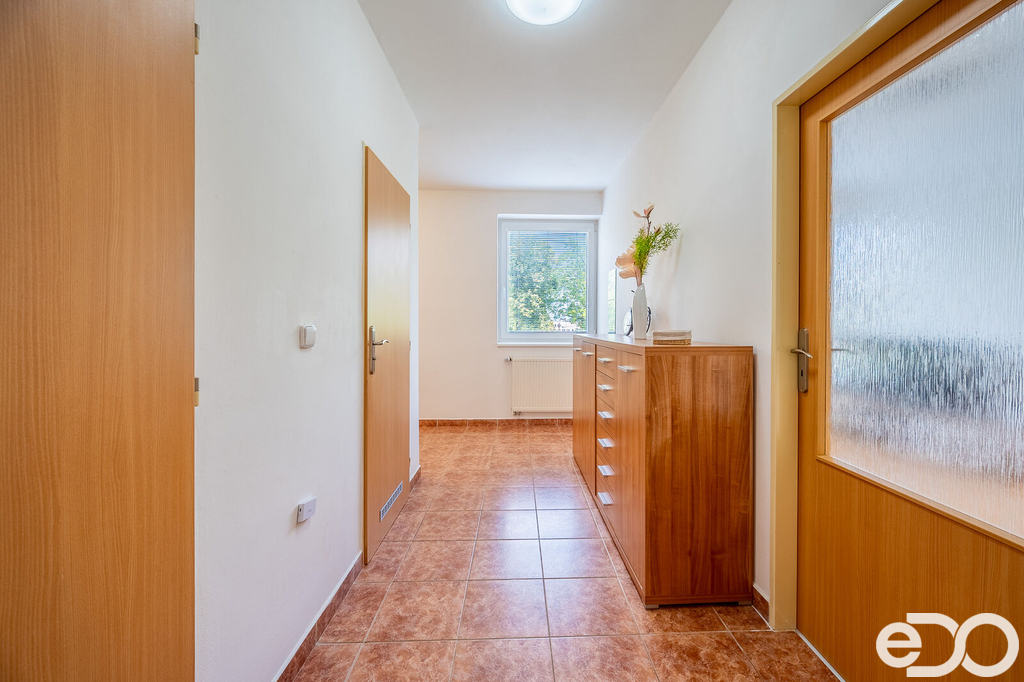 Byt se nachází ve 4. nadzemním podlaží (3. patro), kde Vás nebude rušit ruch ze společných prostor. Přivítá vás prostorná chodba do tvaru L a z ní se dostanete do obývacího pokoje s kuchyní, do prvního pokoje, do koupelny s vanou a umyvadlem a na toaletu. Z obývacího pokoje se dostanete do druhého pokoje a také na balkón. Okna směřují na JV a SZ. Dům je napojen na elektřinu, vodovod a kanalizaci. Teplá voda a topení je zajištěna dálkovým rozvodem. Tedy maximální pohodlí bez námahy. Dům není starý ani 20 let, tudíž v bytě nebyla nutná žádná větší rekonstrukce. Vnitřní rozvody domu jsou ve velmi dobrém stavu a opravována byla pouze střecha.