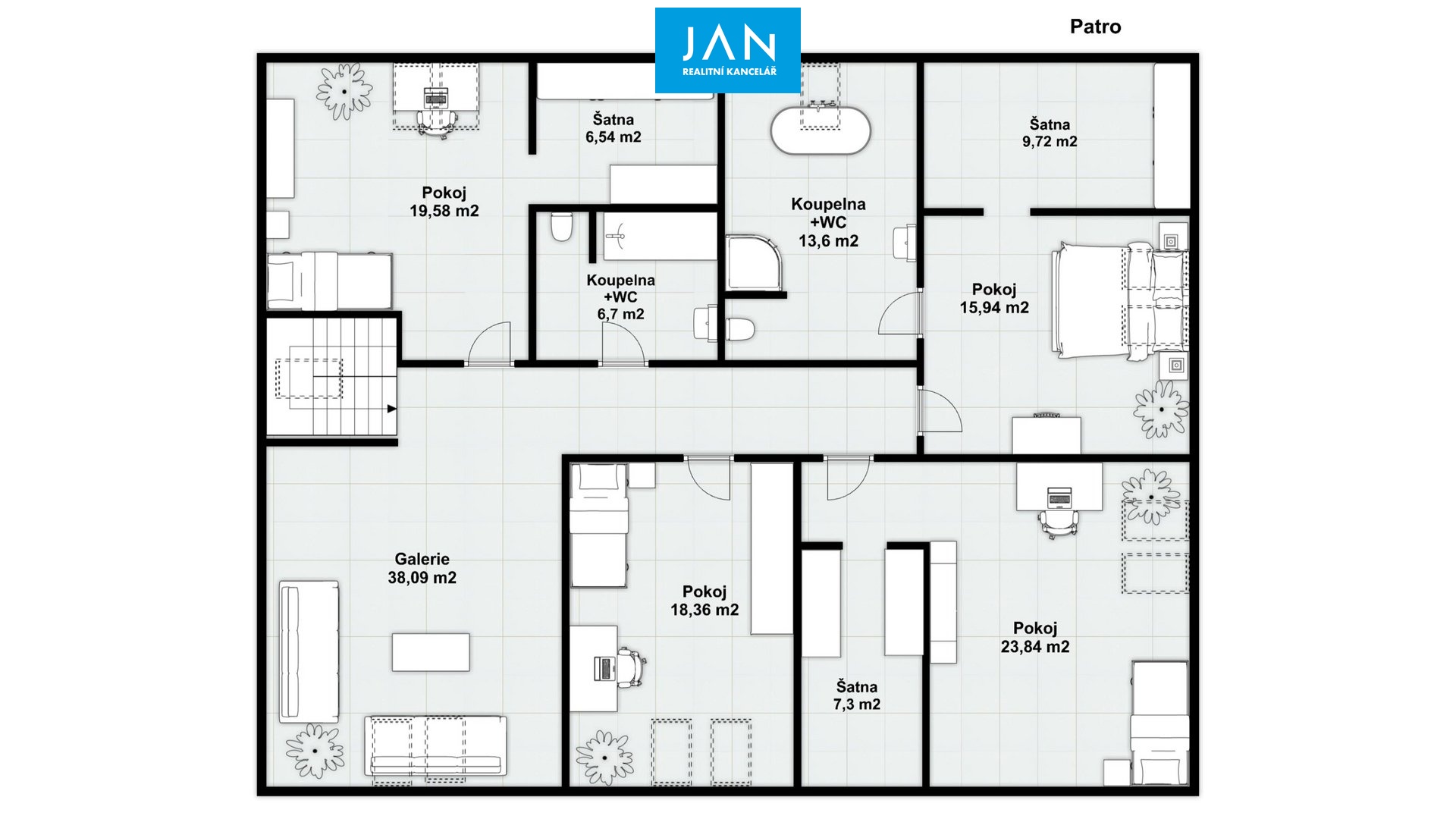 V patře se nachází 4 prostorné pokoje, z toho tři s vlastní šatnou, galerie a dvě koupelny s WC.