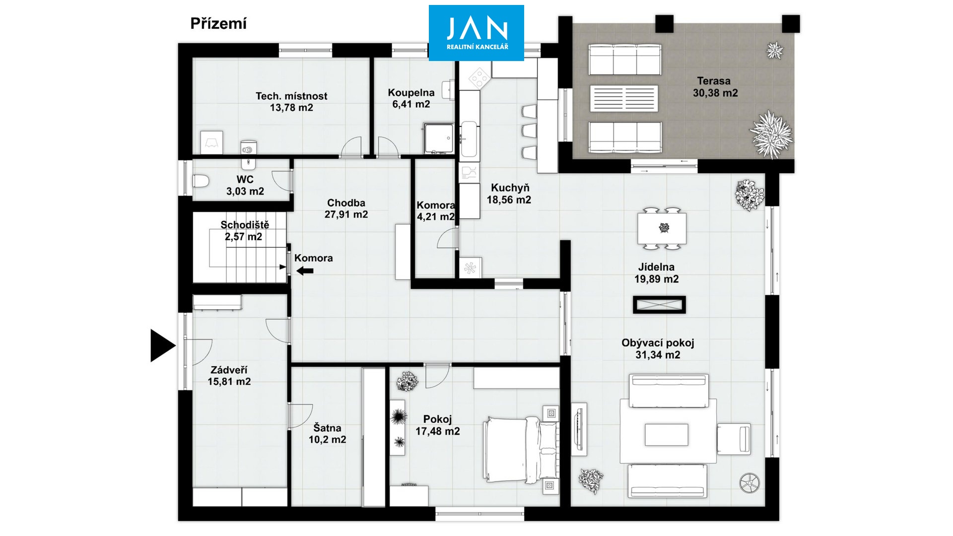 Přízemí tvoří vstupní chodba, šatna, prostorná hala, pokoj, obývací pokoj s krbem a vstupem na terasu, jídelna, plně vybavená kuchyně se spotřebiči MIELE, koupelna, samostatné WC, komora a technická místnost.