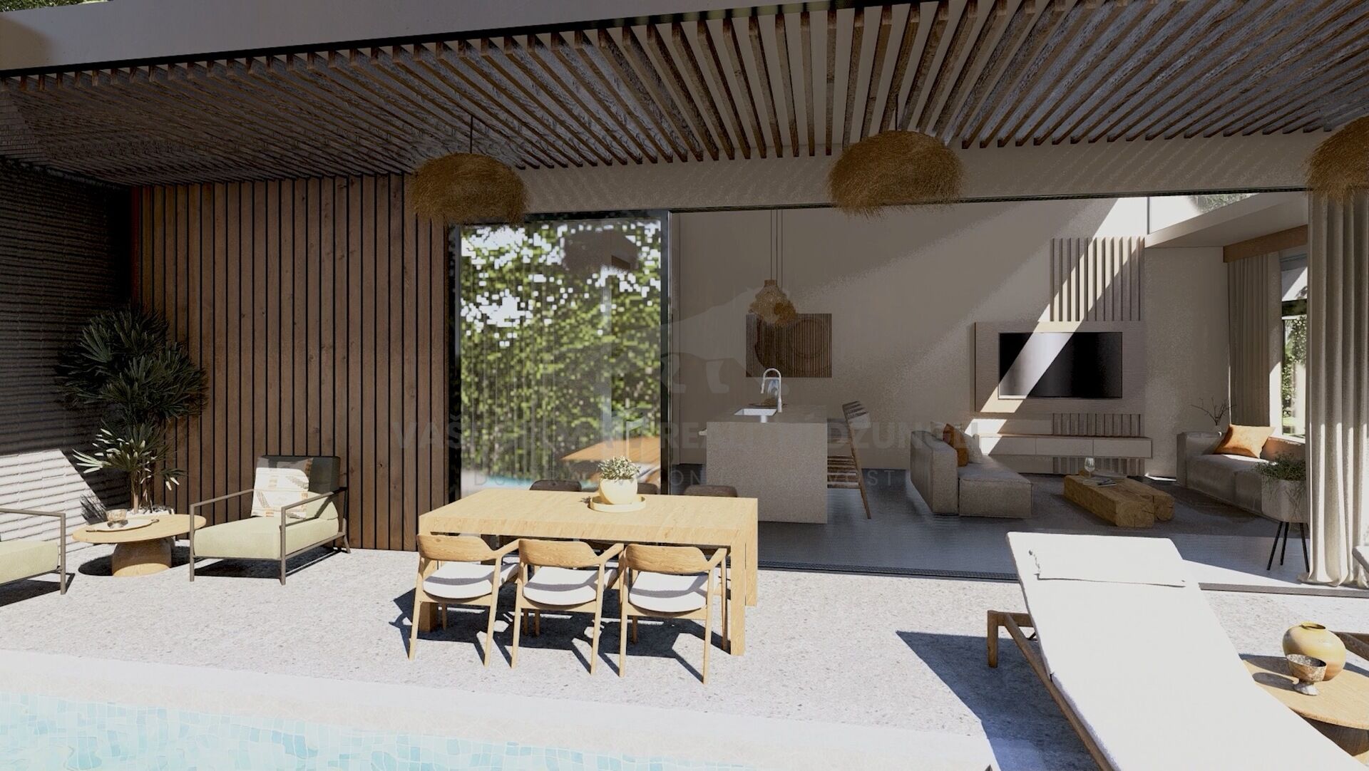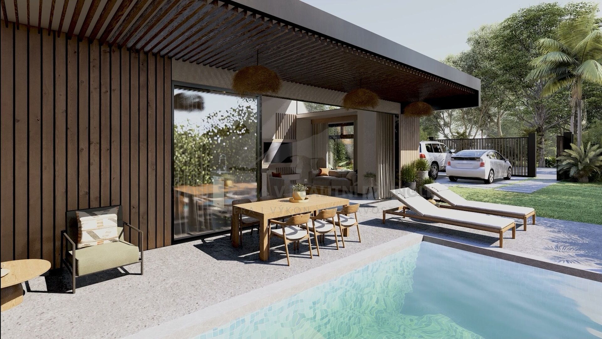 Dům se vyznačuje otevřeným konceptem, který maximálně využívá přirozené světlo a funkčnost, sladěné s rozlehlými skleněnými posuvnými okny, které se otevírají na soukromou terasu a bazén – ideální propojení venkovního divokého živého prostředí s komfortem moderního interiéru pro maximální pocit naplnění.