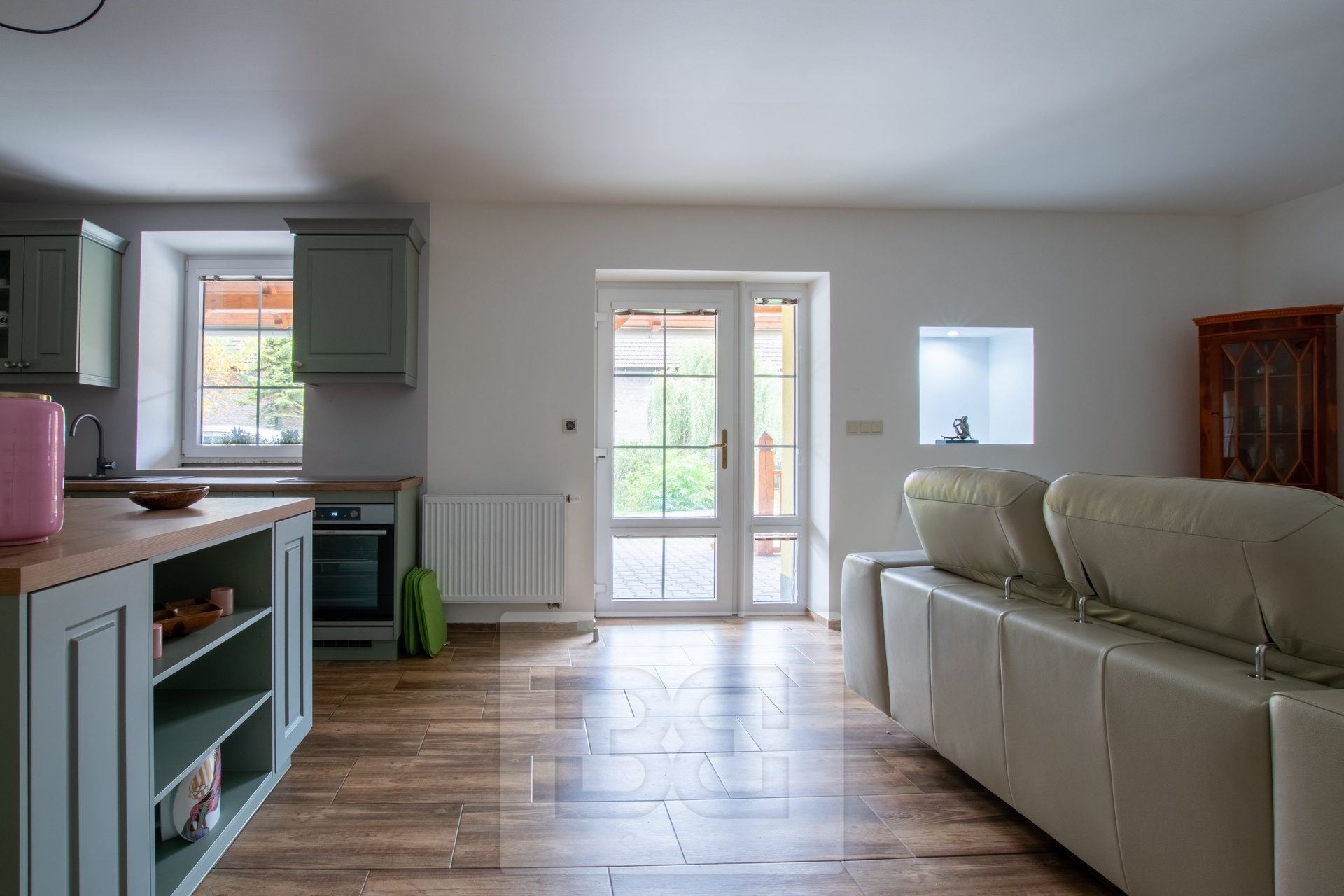 Dům disponuje dvěma samostatnými ložnicemi a světlým obývacím pokojem propojeným s kuchyní, který tvoří hlavní obytnou část domu. Kuchyň nabízí dostatek pracovního i úložného prostoru a navazuje na praktickou komoru umístěnou přímo za kuchyní.