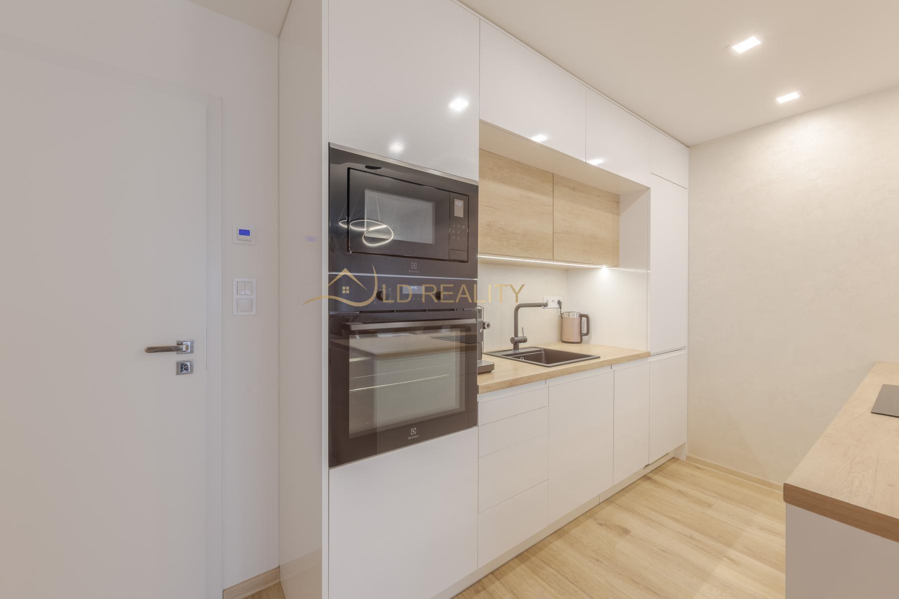 Kuchyňská linka s praktickým ostrůvkem poskytuje dostatek pracovního i úložného prostoru a je vybavena indukční varnou deskou, troubou, mikrovlnnou troubou, myčkou nádobí a digestoří. Z obývacího pokoje je přímý vstup na balkon orientovaný do klidné části.