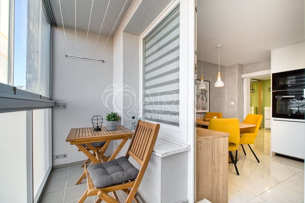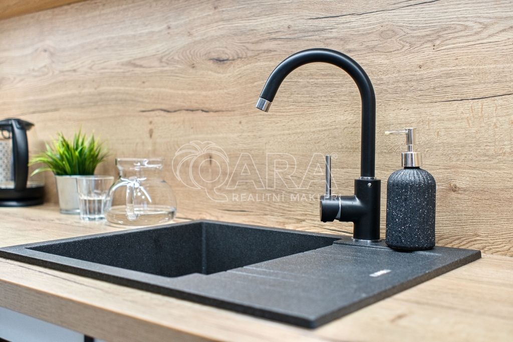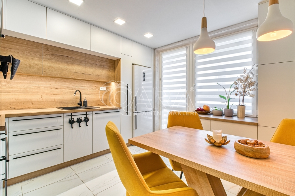 Kuchyň nabízí velké množství úložných prostorů, včetně chytře řešené části za jídelním stolem, a navíc z ní vstoupíte na zasklený balkon, ideální pro ranní kávu i zimní odpočinek.