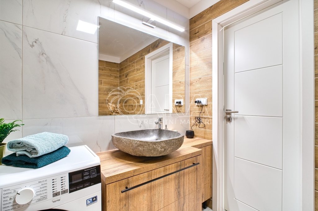 Najdete zde zděné jádro, prostornou koupelnu s vanou a umyvadlem z říčního kamene, kam se pohodlně vejde pračka i sušička.