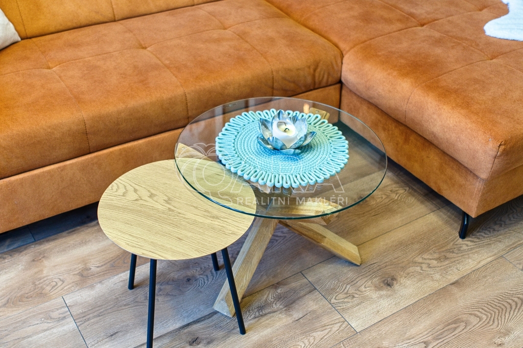 Podlahy jsou plovoucí, v kombinaci s kvalitní dlažbou v předsíni, kuchyni a koupelně.
