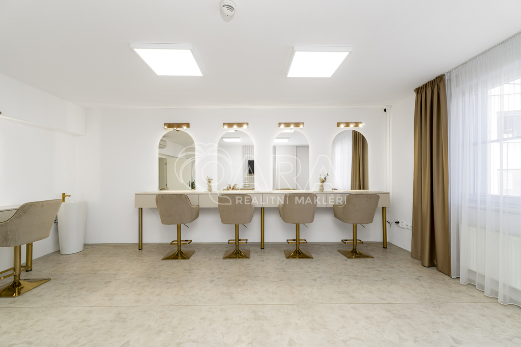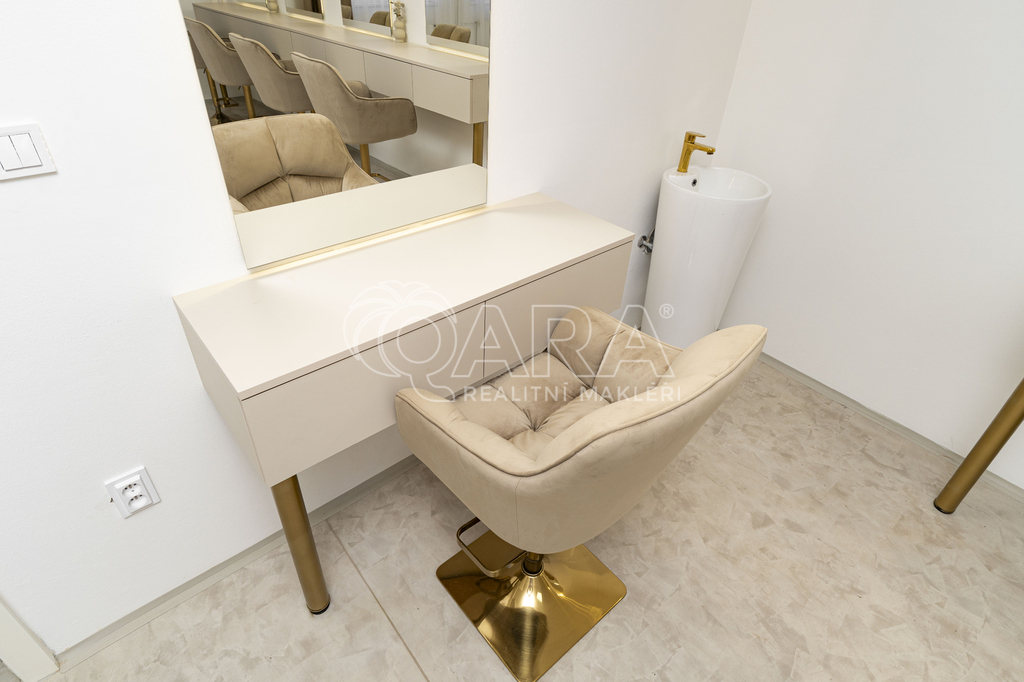 Vybavení: K dispozici je také praktická skříň a komoda pro uložení pracovních pomůcek či textilií, stejně jako záclony a závěsy, které dotvářejí příjemnou a profesionální atmosféru salonu. Křesla a zrdcadla nejsou zahrnuty v ceně, ale je možné jej odkoupit nebo pronajmout. Pokud by vám tento prostor nevyhovoval, na stejném podlaží máme k dispozici také druhý — podívejte se na naši nabídku v inzerci.