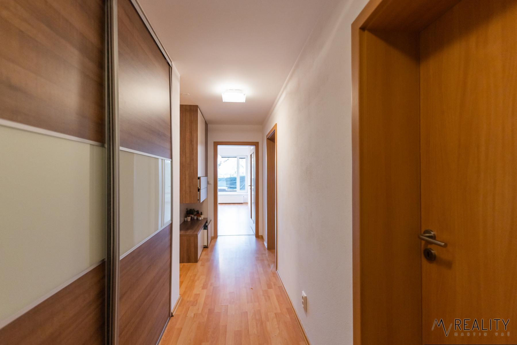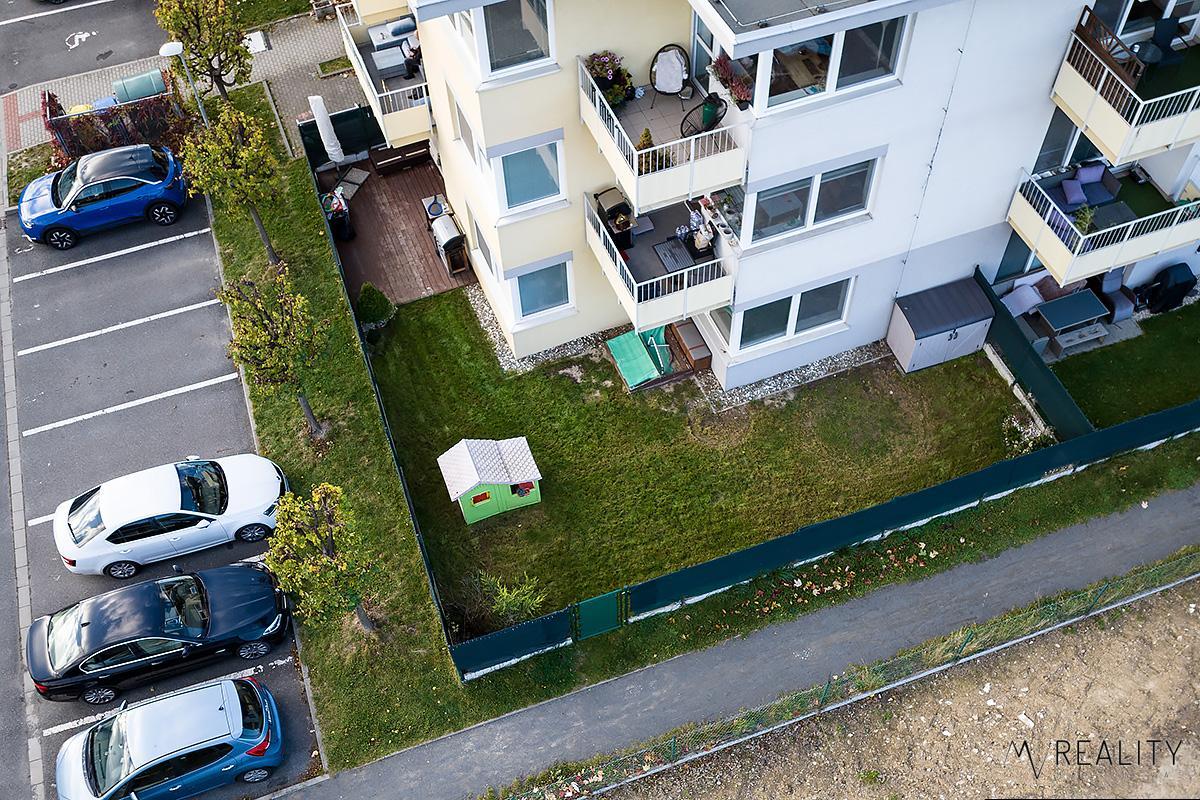 Byt se nachází v přízemí domu, díky čemuž je z obývacího pokoje přímý vstup na soukromou předzahrádku, která poskytuje ideální prostor pro relaxaci, posezení s rodinou či přáteli nebo bezpečné hraní dětí.