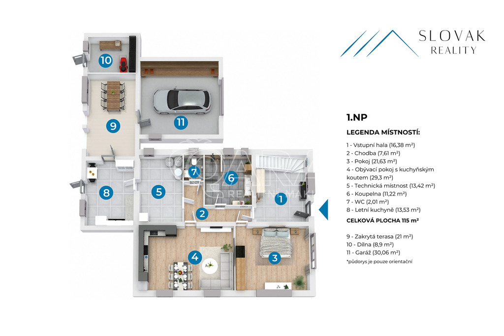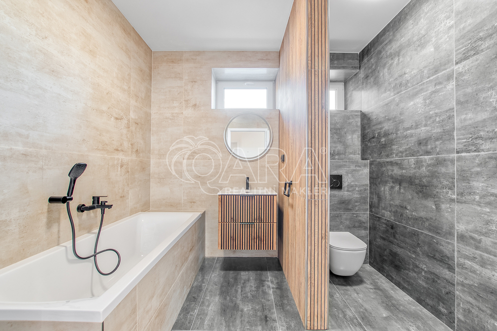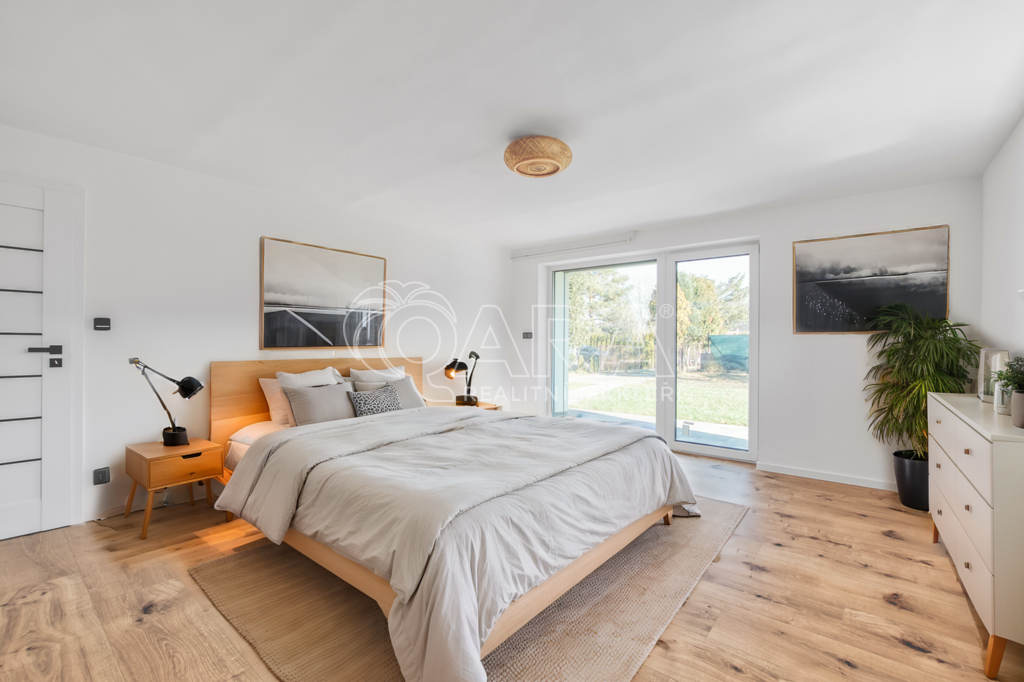 Přízemí domu nabízí vše potřebné pro pohodlný život. Nachází se zde prostorná koupelna se sprchovým koutem, která je vybavena elektrickým podlahovým topením. Dále zde najdete ložnici s francouzským oknem a venkovními roletami, která může sloužit i jako pracovna. Hlavní obytný prostor tvoří obývací pokoj propojený s kuchyní, kde jsou již připraveny přípojky pro spotřebiče. V přízemí se nachází také technická místnost s tepelným čerpadlem a 280l bojlerem a praktická letní kuchyně, ze které se vchází přímo na krytou terasu o velikosti 21 m².
