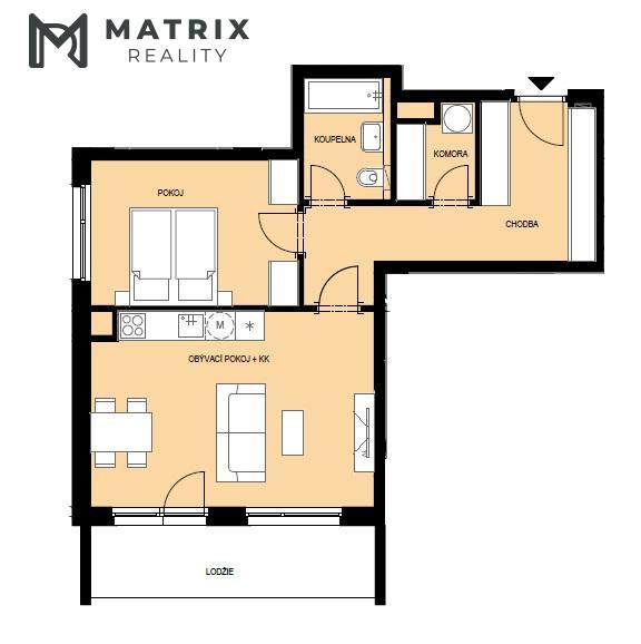 Dispozici bytu tvoří prostorná chodba, obytná část s kuchyňskou linkou, ložnice, koupelna se záchodem a komora s přípravou na napojení pračky. Lodžie je orientována jižním směrem a poskytuje dostatečné soukromí pro relaxaci a odpočinek.