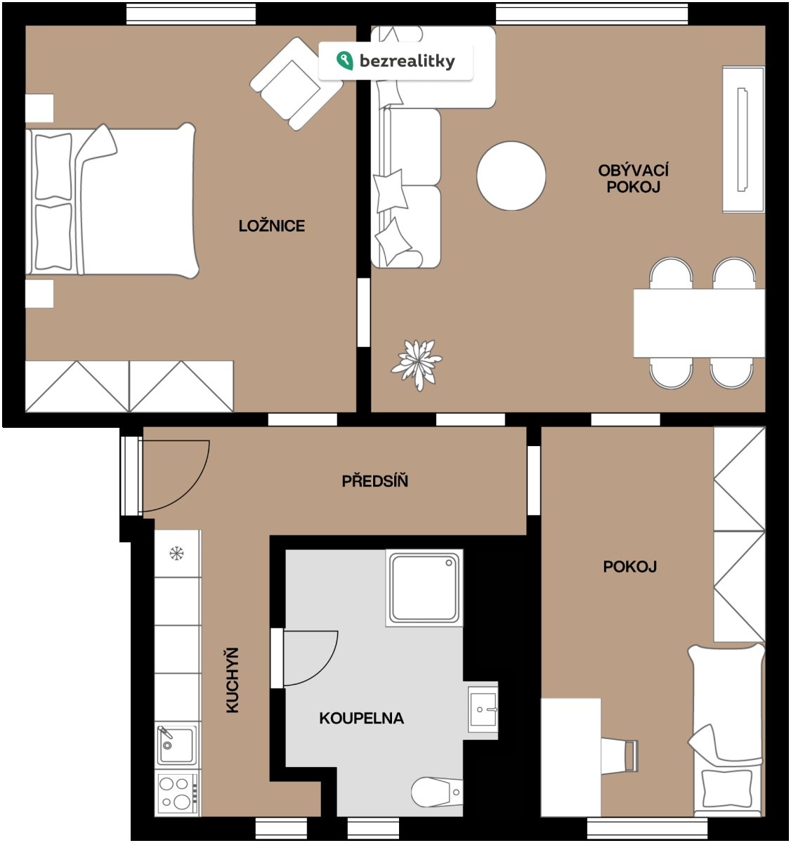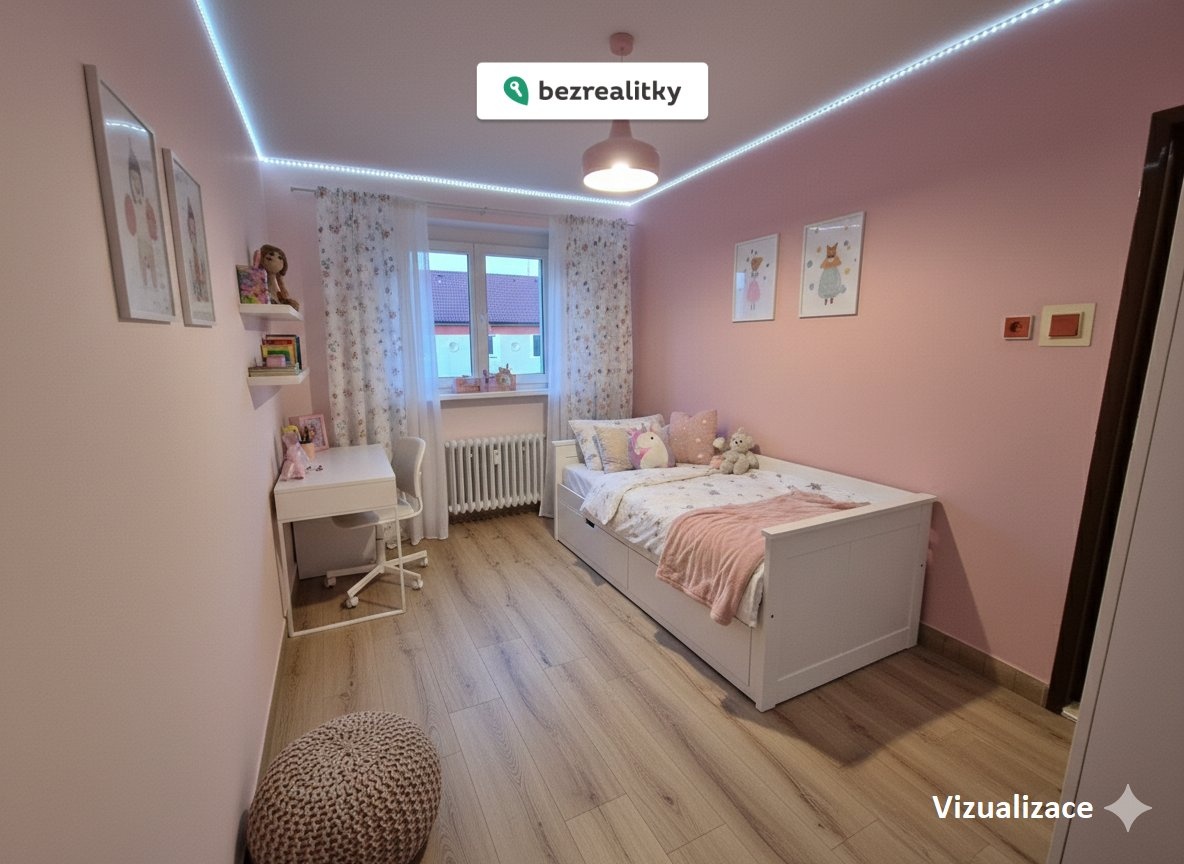 Dispozice bytu je praktická a funkční. Byt se skládá z obývacího pokoje, hlavní ložnice a dalšího samostatného pokoje, který lze využít jako dětský pokoj, pracovnu nebo menší ložnici. Okna obývacího pokoje a hlavní ložnice jsou orientována na jih, menší pokoj na sever. Kuchyně je řešena odděleně, což ocení zejména ti, kteří preferují jasně oddělený obytný a pracovní prostor. Dispozice vznikla úpravou původního uspořádání 2+1.