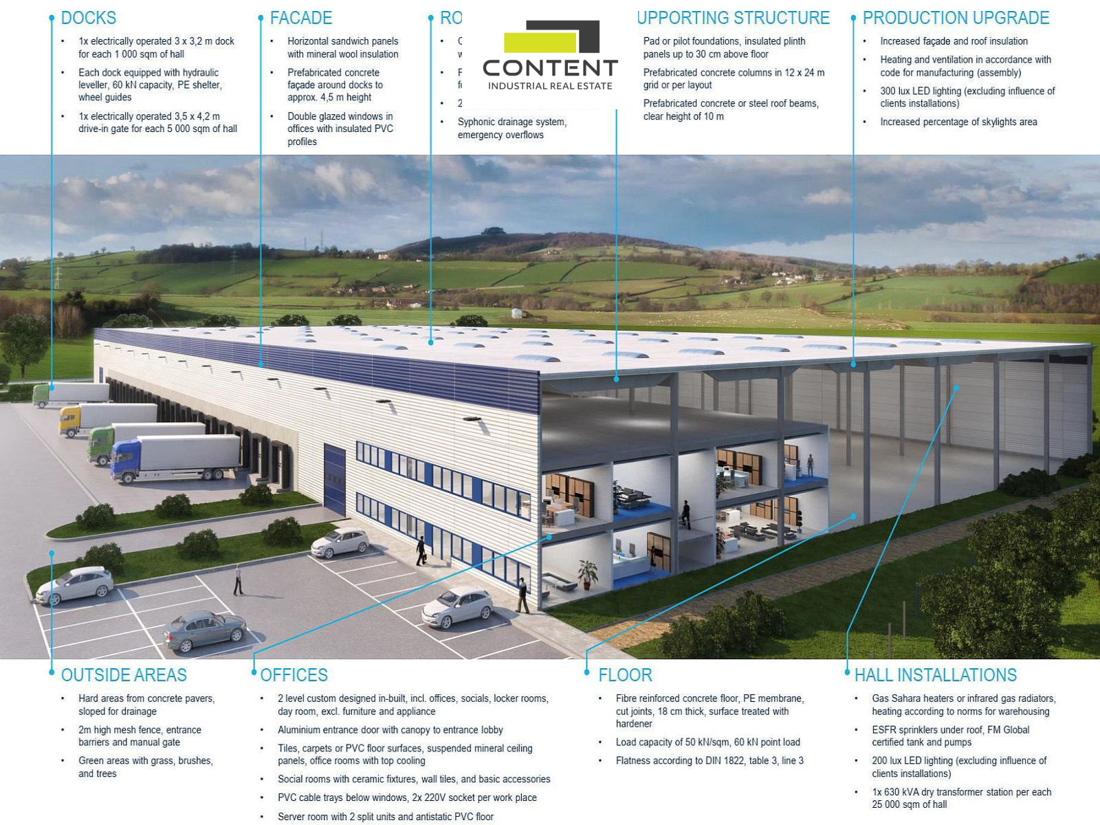 V zastoupení majitele a bez provize nabízíme samostatné industriální prostory, vhodné pro sklad nebo výrobu, umístěné v novém komerčním parku přímo u dálnice D6, EXIT 7.