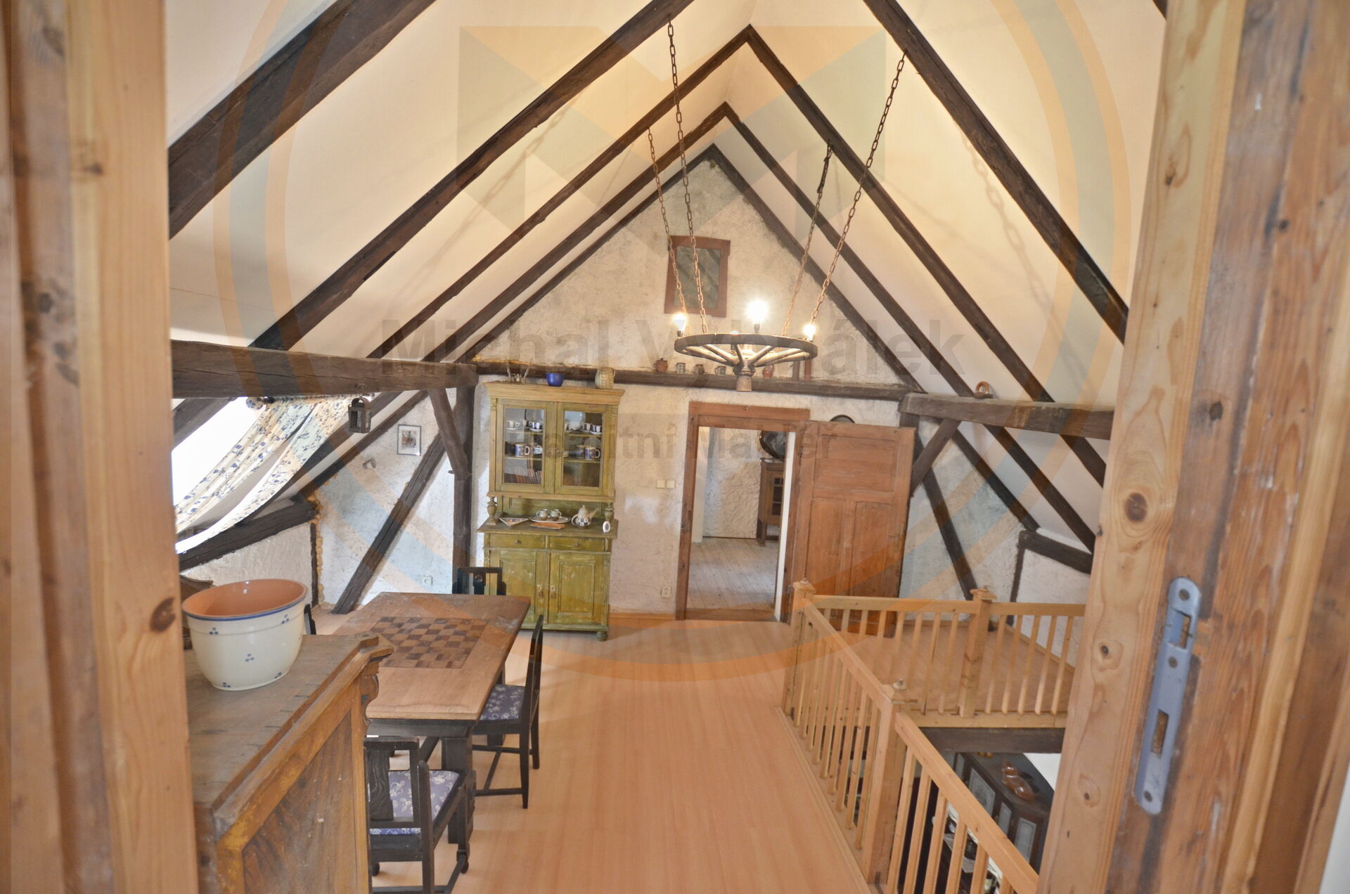 Horní patro: spojuje členitá chodba využívaná jako hrací a odpočinkový prostor. Pokoj nad kuchyní (33 m²) a pokoj s vestavěným patrem na spaní (35 m²). Celé horní patro prošlo rekonstrukcí.