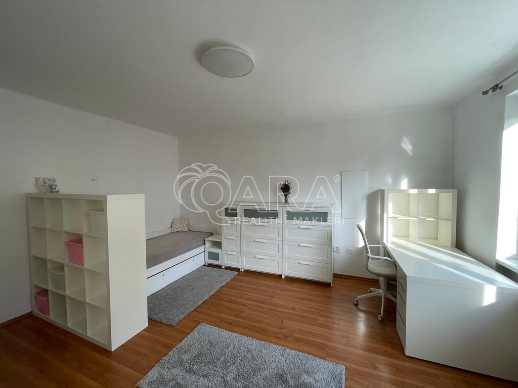 Kuchyňská linka je vybavena spotřebiči (plynová varná deska, myčka, elektrická a mikrovlnná trouba, digestoř a lednice). V obývacím pokoji budete mít k dispozici velkou sedací soupravu s taburetem, konferenční stelek, TV stolek, držák na TV a lampu. V ložnici je velká manželská postel, vestavná skříň, psací stůl a židle. V dětském pokoji jsou dvě postele, psací stůl a židle a tři skříně. V koupelně je pračka, vana umyvadlo a topný žebřík a na chodbě jsou tři prostorné, vestavné šatní skříně. Další vybavení můžete vidět na fotografijích. Úložné prostory jsou v bytě opravdu nadstandardní. WC je samostatně.