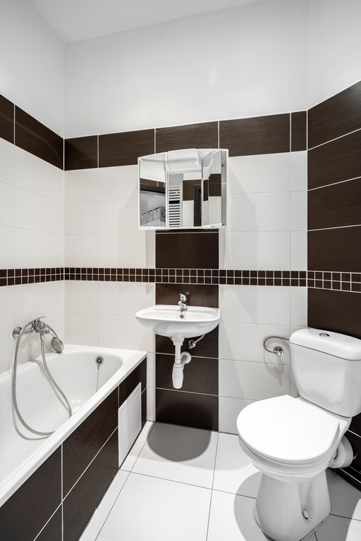 Dispozici tvoří pokoj, kuchyň, předsíň a koupelna s toaletou. Součástí vybavení je kuchyňská linka s elektrickým sporákem se sklokeramickou varnou deskou a digestoří.