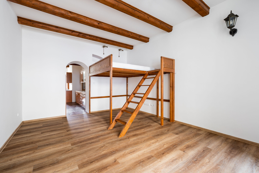 Zařízená je kuchyňskou linkou včetně vestavné elektrické trouby, sklokeramické varné desky, digestoře, dále jídelním stolem s židlemi, vestavěným patrem na spaní s matrací, vestavěnou šatní skříní, věšákem, koupelnovým nábytkem a pračkou.