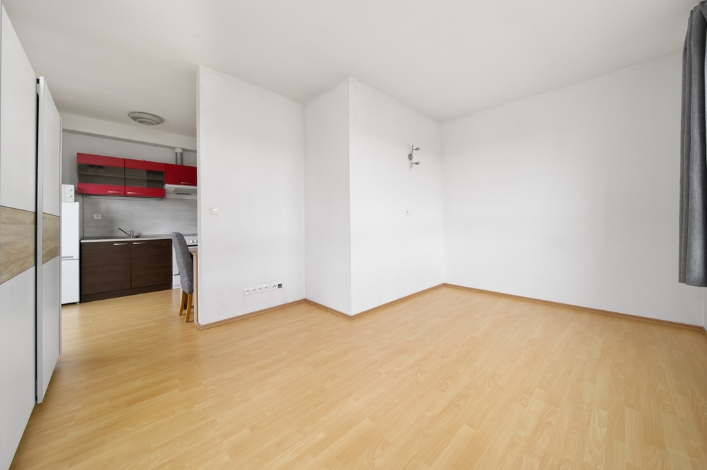 Kuchyňský kout je vybavený kuchyňskou linkou, elektrickým sporákem se sklokeramickou varnou deskou a digestoří. V bytě dále zůstává jídelní stůl a šatní skříň. Vytápění je ústřední, stejně tak i teplá voda je dodávána dálkově. Pro TV přenos je zde společná anténa a internet.