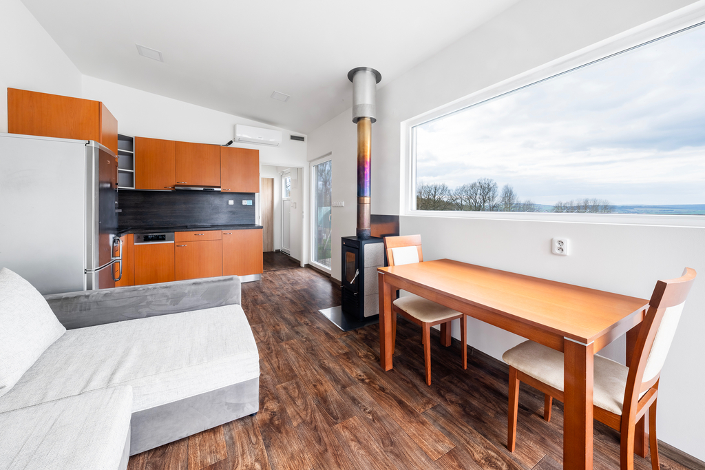 Nabízíme k prodeji energeticky úsporný mobilní dům vybavený veškerým nábytkem a spotřebiči. Díky zateplené a stabilní konstrukci bez podvozku je vhodný pro celoroční užívání. Mobilheim byl vyroben na zakázku, má dispozici 2+kk a vnější rozměry 10,5 × 3,8 metru. Vnitřní uspořádání zahrnuje prostorný obývací pokoj s kuchyňským koutem, ložnici, předsíň a koupelnu s toaletou. Konstrukce mobilheimu odpovídá výrobkům s funkcí stavby. Základ tvoří svařovaný ocelový rám. Podlaha je vyrobena z ocelových profilů, které jsou vyplněné tepelnou izolací a překryté OSB deskami a linoleem. Stěny jsou sendvičového typu, tvořené polyuretanovými panely, doplněné o vnitřní kovový rám a sádrokartonové desky. Tento systém zajišťuje dobrou tepelnou i zvukovou izolaci. Strop je rovněž zateplený a tvořený kombinací polyuretanových panelů a vnitřní povrchovou úpravou. Okna i dveře jsou plastová, přičemž všechna okna jsou vybavena elektricky ovládanými předokenními žaluziemi. Mobilheim je nabízen s kompletním vnitřním vybavením, včetně kuchyňské linky s elektrickou varnou deskou, digestoří, elektrickou troubou, mikrovlnnou troubou, myčkou nádobí a lednicí s mrazákem. V ceně je rovněž zahrnut nábytek a ostatní spotřebiče dle fotografií. Disponuje také systémem zabezpečovacího zařízení s pohybovými senzory. Hlavním zdrojem vytápění je tepelné čerpadlo typu vzduch–vzduch. Pro zpříjemnění atmosféry v chladnějších měsících jsou v obývacím pokoji navíc instalována krbová kamna na tuhá paliva. Komfortní vnitřní klima bez ztrát tepla podporuje rekuperační jednotka, která průběžně zajišťuje výměnu vzduchu v interiéru. Vodu ohřívá elektrický bojler umístěný v koupelně. Dům je připojen na inženýrské sítě – vodu, elektřinu i odpad. Je rovněž zkolaudovaný jako stavba, která splňuje veškeré legislativní požadavky, což umožňuje případné financování prostřednictvím hypotečního úvěru nebo jiného úvěrového produktu (vždy dle podmínek konkrétní banky). Mobilheim je připravený k převozu na nové místo. Cena je na vyžádání u makléře. Možnost odpočtu 21 % DPH. Pozemek není součástí prodeje. Pro bližší informace či domluvení prohlídky volejte na uvedený mobilní telefon.
