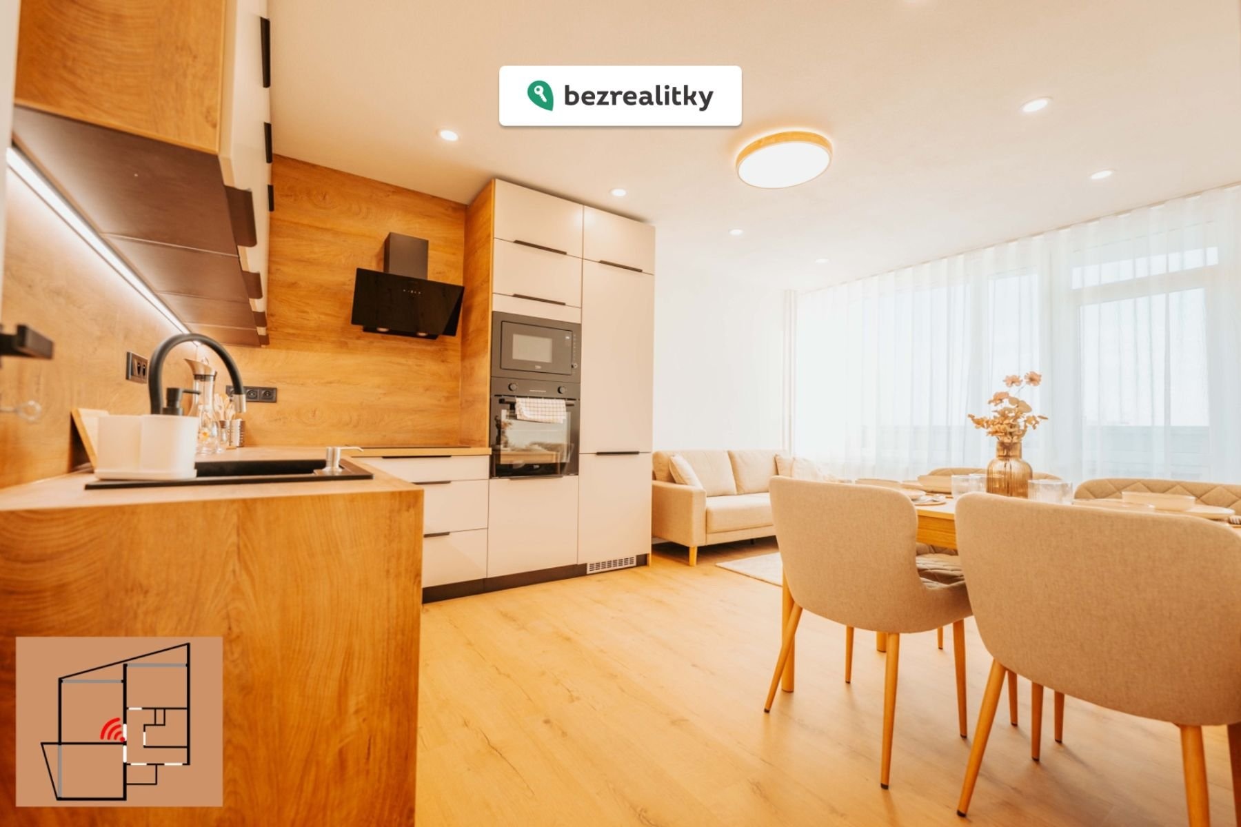Samotný byt disponuje velice praktickým a moderním rozložením. Při vstupu do bytu se ocitnete v předsíni, ze které můžete přejít do oddělené komory / šatny, vhodné pro uložení bot, oděvů či sezónních věcí. Z centrální chodby je vstup do všech čtyřech místností - tou hlavní je největší místnost, ve které je propojena kuchyně s obývacím pokojem. Moderní, prostorná kuchyně nabízí vše, co od nové kuchyně očekáváte - praktické uspořádání a dostatek úložného prostoru.