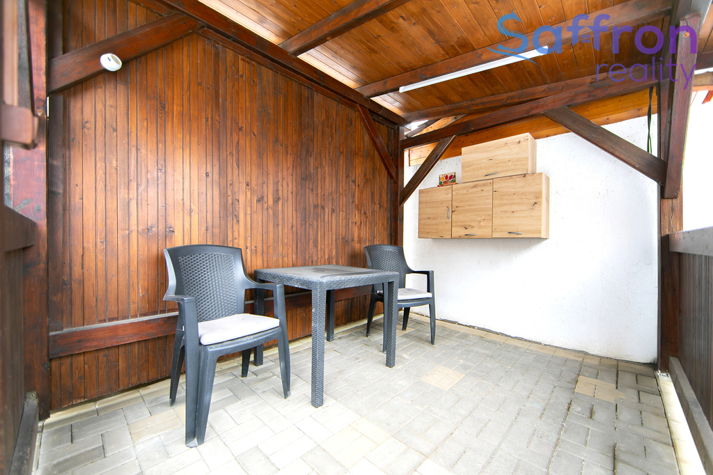 Součástí domu je také zahrada, která poskytuje příjemné soukromí a prostor pro odpočinek. Nachází se zde zastřešené posezení vhodné pro relaxaci i rodinná setkání a dále kotec pro psa, který lze případně využít také jako praktický úložný prostor pro zahradní vybavení nebo nářadí.