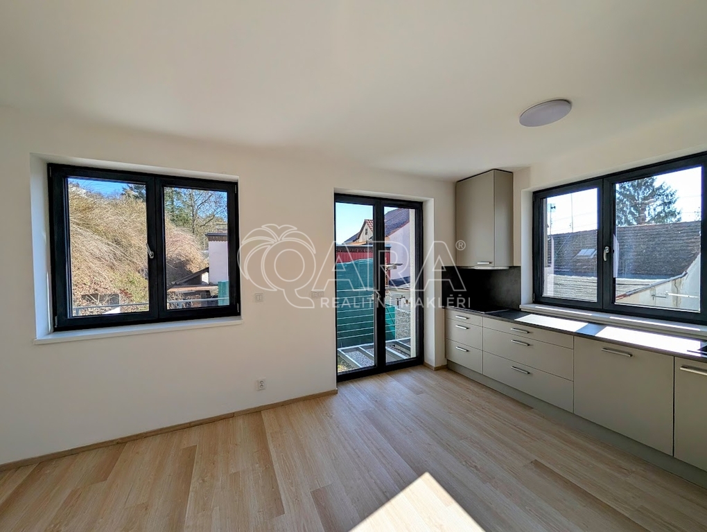 Na míru vyrobené kuchyňská linka a dvě plně vybavené koupelny.