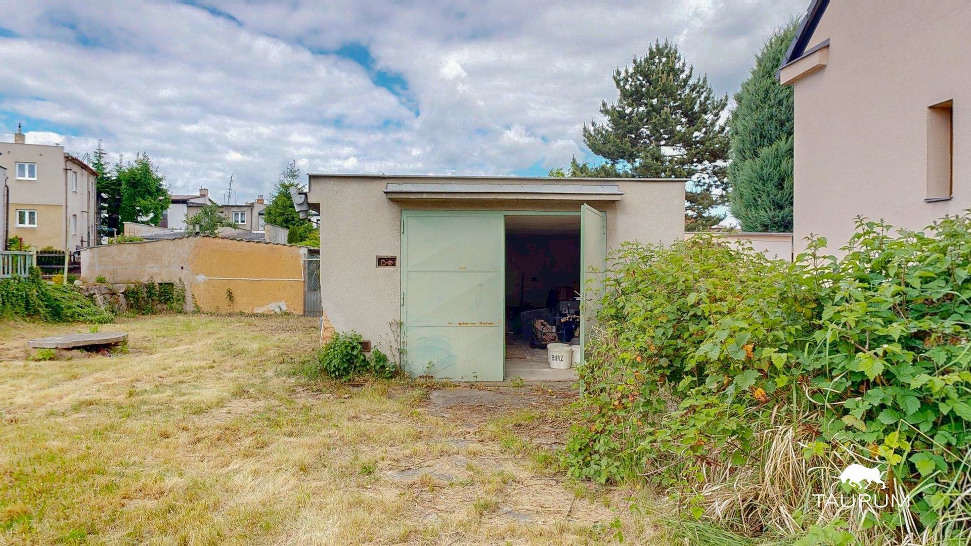 Zahrada okolo domu je porostlá trávou a je kompletně oplocená. Stojí na ní garáž, která byla dostavovaná v pozdějších letech o výměře 39 m2 a dále zde najdeme studnu s užitkovou vodou. Parkovat se dá bez problému na pozemku, kam lze vjet skrze vrata a nebo v Libušínské ulici.