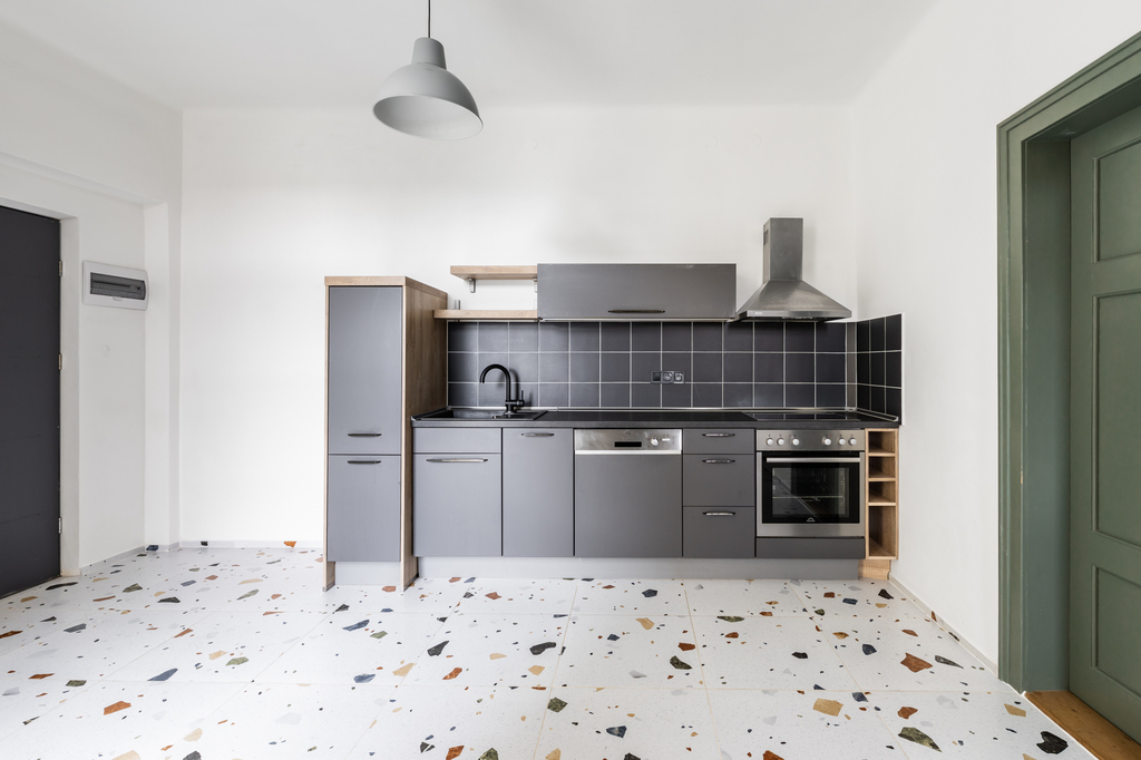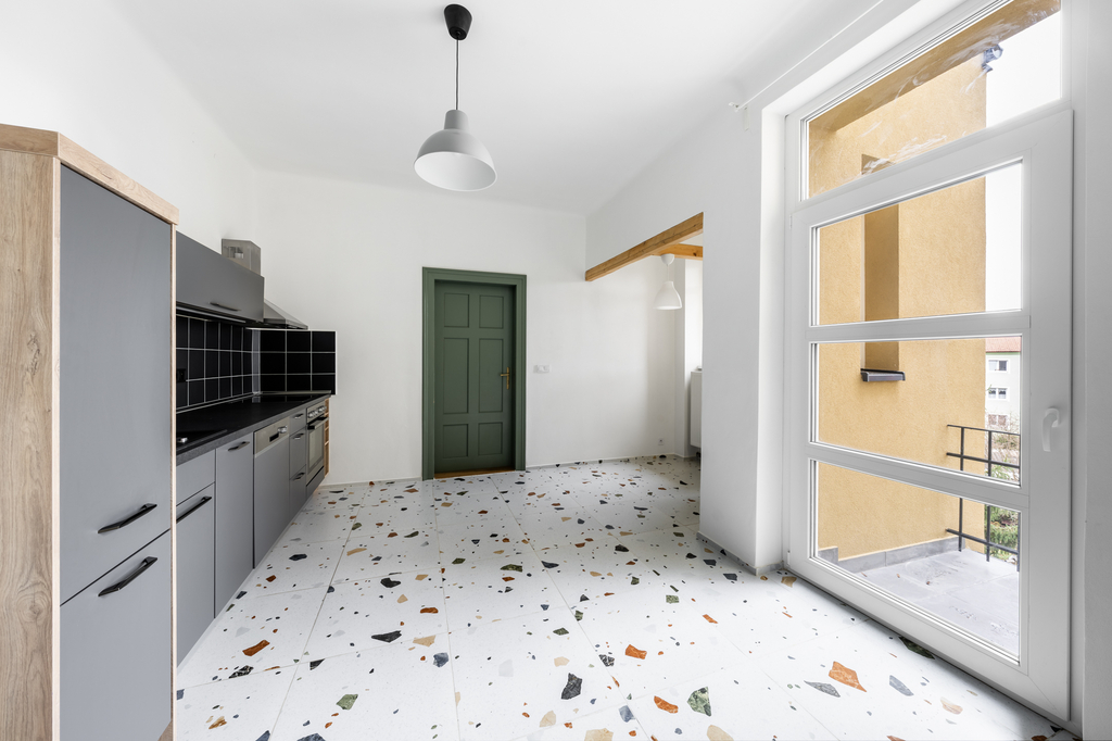 Byt je zařízený moderní kuchyňskou linkou včetně vestavné sklokeramické varné desky, digestoře, elektrické trouby a myčky nádobí. Vytápění bytu je ústřední, totéž dodávka teplé vody.