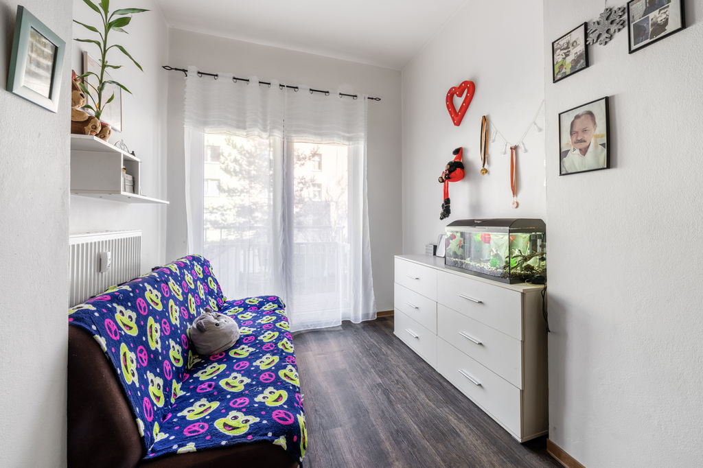 Bytová jednotka je situována do 1. nadzemního podlaží (zvýšeném přízemí) zatepleného cihlového domu. Dispozice bytu zahrnuje kuchyň, prostorný pokoj se vstupem na balkon, předsíň a koupelnu s toaletou.