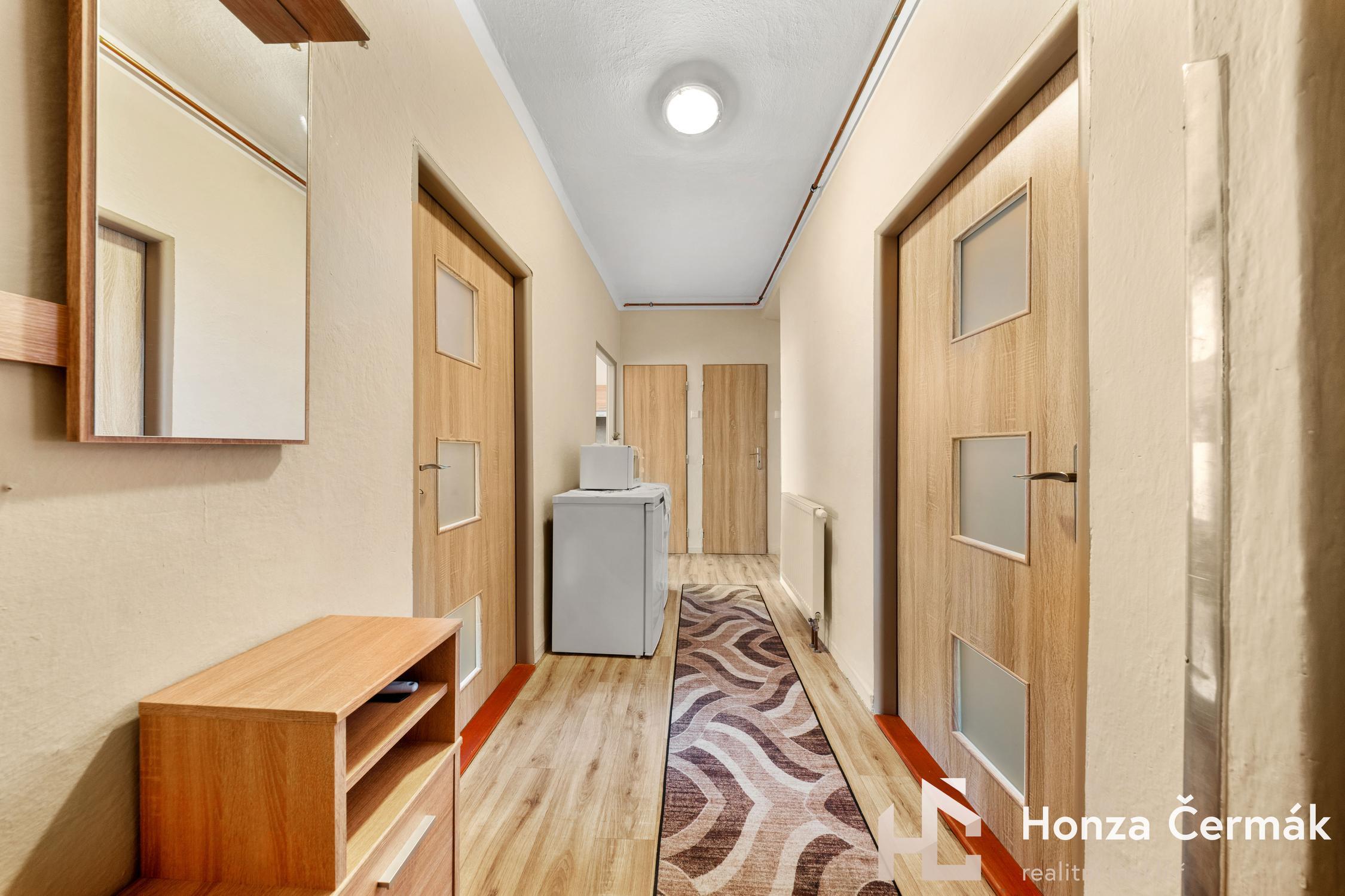 Byt má podlahovou plochu 68,66 m² a jeho dispozice je navržena velmi účelně. Pokud byste však preferovali vzdušnější styl bydlení, velkou výhodou je možnost jednoduché úpravy na 3+kk. Stačí odstranit jednu nenosnou příčku a získáte otevřený obývací prostor s kuchyňským koutem. Interiér prošel částečnou technickou modernizací, kdy jsou v celém bytě nové rozvody topení v mědi včetně radiátorů a plynového kotle. Odpady jsou již vedeny v plastu a v kuchyni je nově udělaná elektroinstalace v mědi.