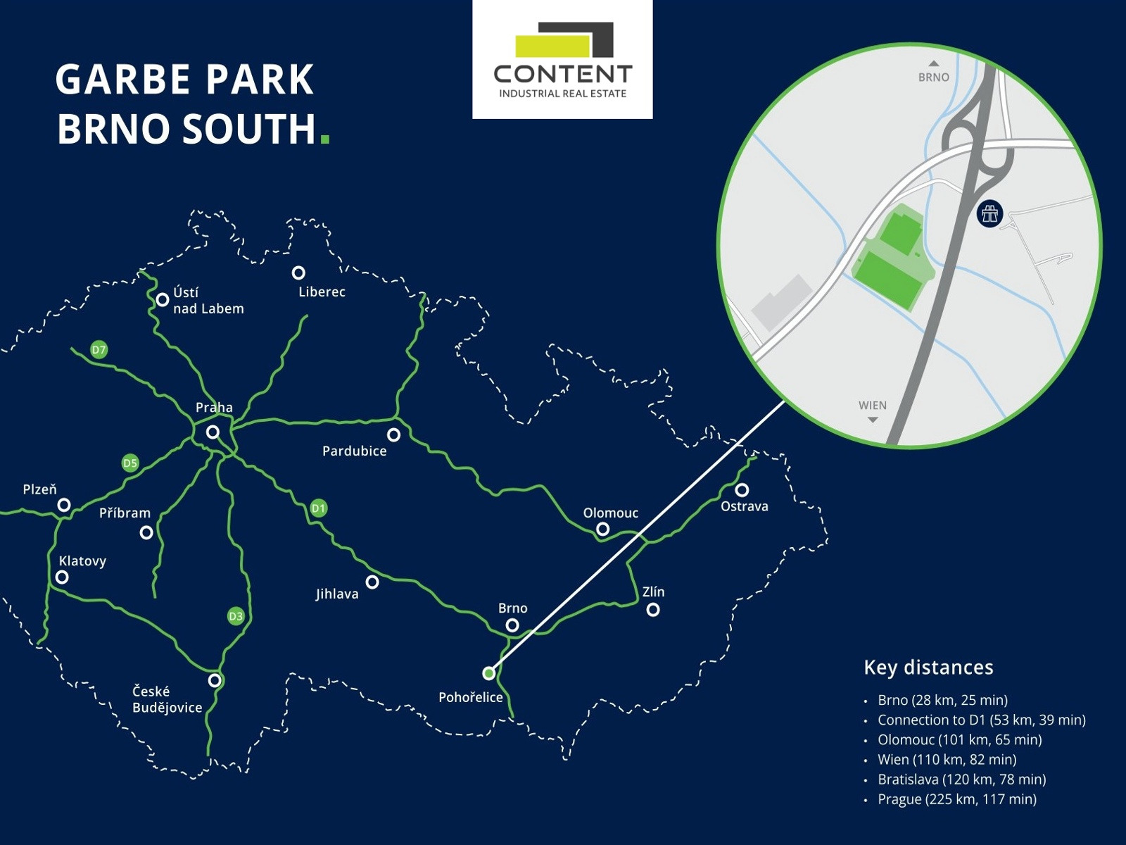 V zastoupení majitele a bez provize nabízíme novostavbu skladu nebo výrobních prostor o velikosti 19825 m², umístěnou v moderním parku nacházejícím se podél dálnice D52, EXIT 23.