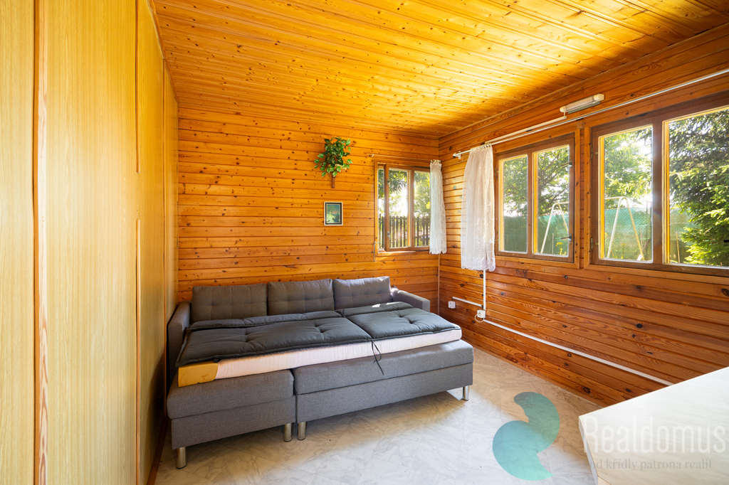 Dřevěný zahradní domek o dispozici 1+kk, umístěný na betonových patkách.