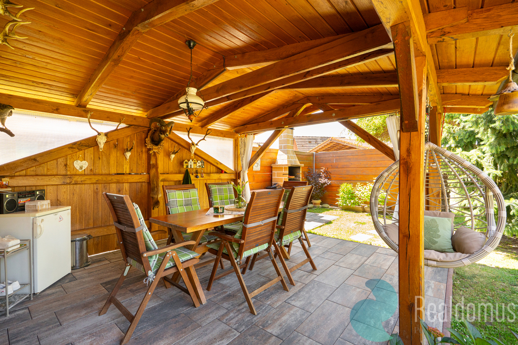 Venkovní posezení s krbem, 2 x přístřešek na vozidla, studna, příjezdová brána do objektu na el. ovládání.
