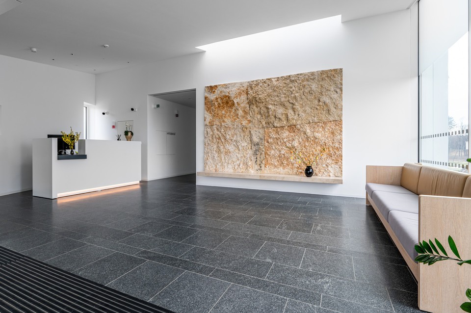 Vybavení zahrnuje: velkoformátová hliníková okna s izolačními trojskly po celé délce obývací části a možností posuvného otevíraní v celé délce, velkoformátová dlažba a obklady v nadčasové barvě designu, bezpečnostní vstupní dveře, klimatizace.