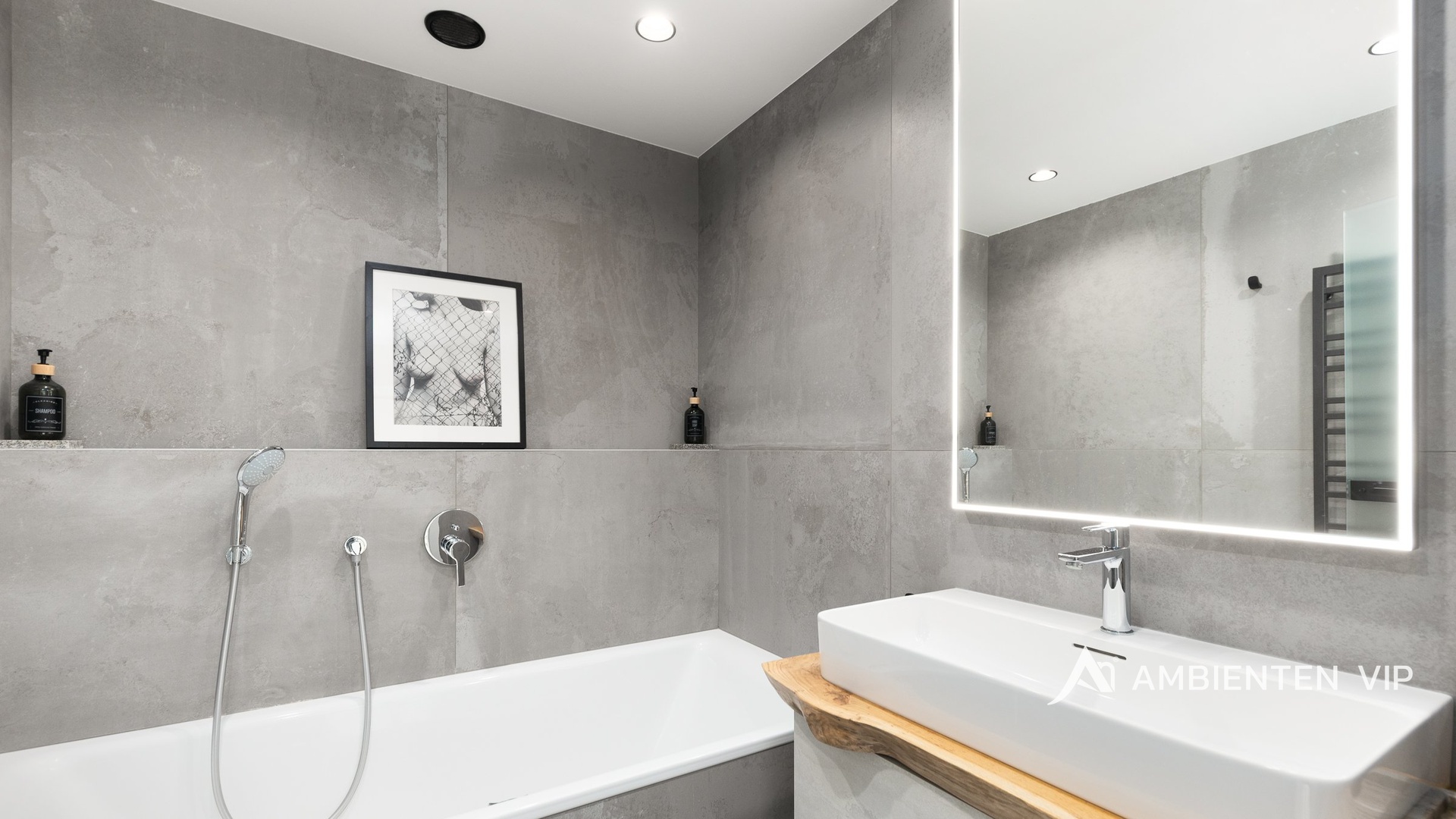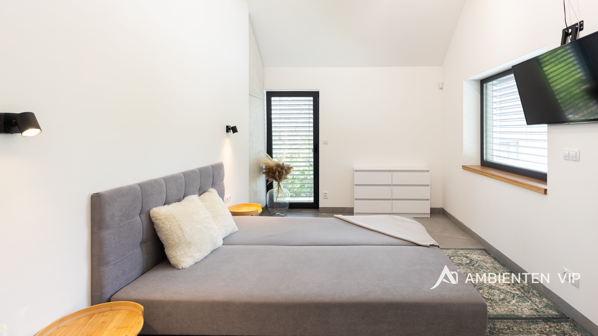 V prvním patře se nachází 3 samostatné pokoje, koupelna s vanou a oddělená toaleta. Hlavní ložnice disponuje vlastní šatnou a má přímý vstup na prostorný balkon, který nabízí jedinečné panoramatické výhledy. V domě se nachází půda, která aktuálně slouží k uložení věcí. Zařizovací předměty jsou od firmy Duravit, baterie od firmy Grohe, umyvadla a toalety od firmy Laufen, zrcadla a doplňky od firmy Nymco. V celém domě je designové osvětlení, zásuvky a vypínače Schneider, WI-Fi vypínače v horním patře domu. Vytápění domu je řešeno přes teplené čerpadlo De Ditrich – podlahové topení s termostaty, dále krb Thor Kratki – pohledový ze tří stran.