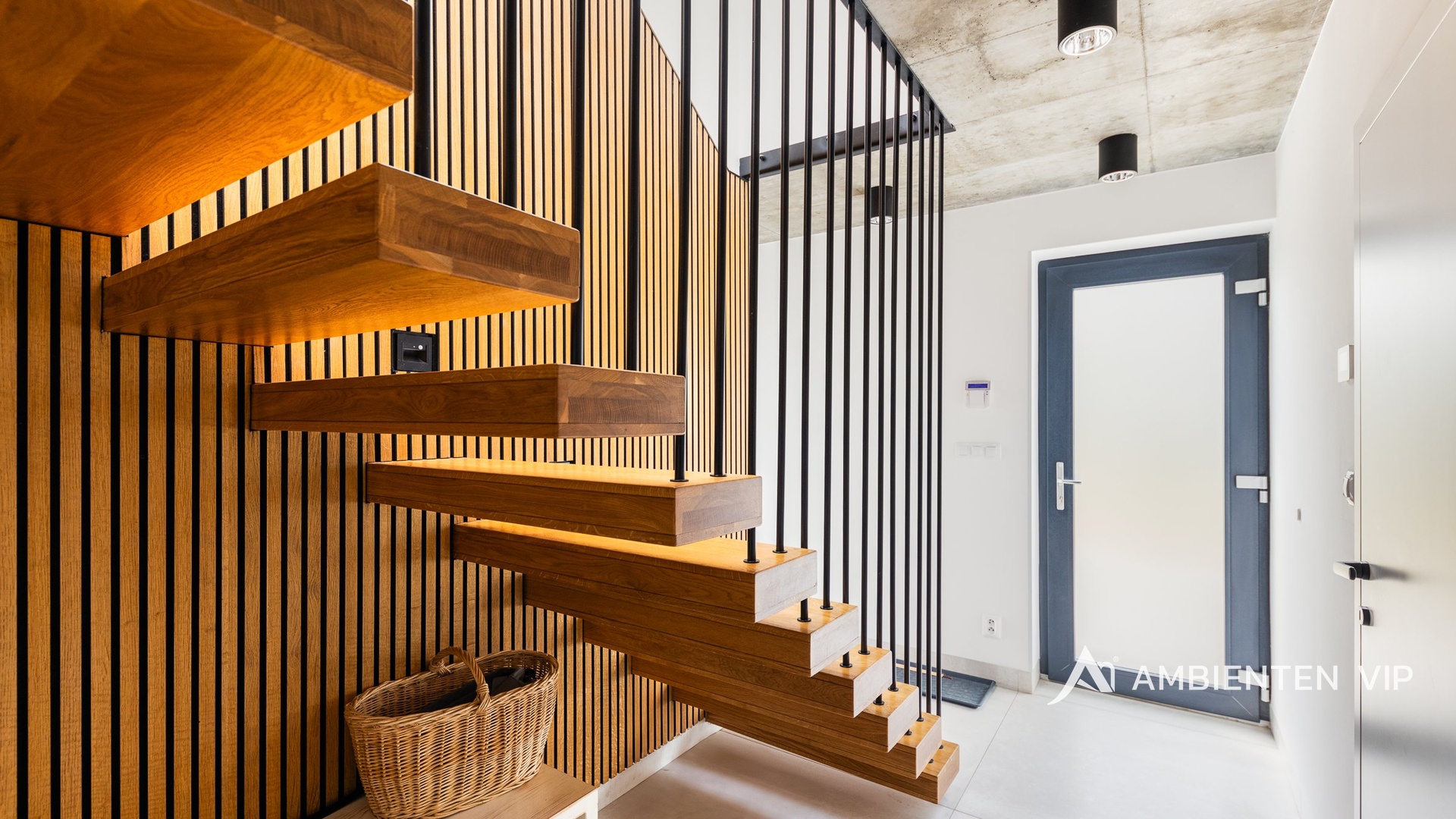 V přízemí domu se nachází vstupní hala, otevřená dispozice obývacího prostoru s kuchyňským koutem, spíž, technická místnost a koupelna se sprchovým koutem a toaletou. Kuchyně je vybavena moderními vestavěnými spotřebiči AEG – lednicí, elektrickou a mikrovlnnou troubou, indukční varnou deskou Franke, digestoří, myčkou a nabízí vám mnoho úložného prostoru. Z obývacího prostoru je přímý vstup na terasu s posezením. Nabídne vám nádherné výhledy do okolní krajiny a naprosté soukromí na zahradě.