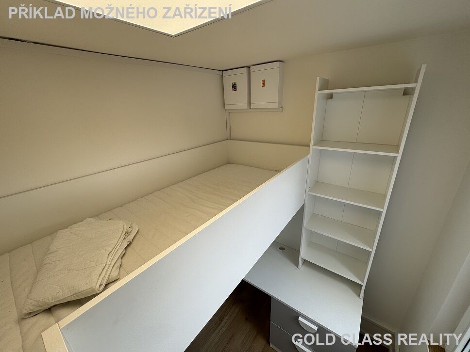 Jednotky jsou tvořeny malou předsíňkou s moderně vybavenou kuchyní na míru vč. vestavěných spotřebičů zahrnujících mikrovlnnou troubu i ledničku a indukční varnou deskou na vaření (2m2), odděleným WC (1m2) a slunnou místností s velkým oknem a volným výhledem (5m2). Úložný prostor je důmyslně řešen závěsnými skříňkami na míru. Po dohodě lze zařídit dalším nábytkem (např. skříň, postel, stůl, židle, atd.) a okamžitě pronajmout za 10.000 Kč/měsíc (7.700 nájem, 2.300 zálohy na služby), což znamená roční výnos téměř 5 % p.a.