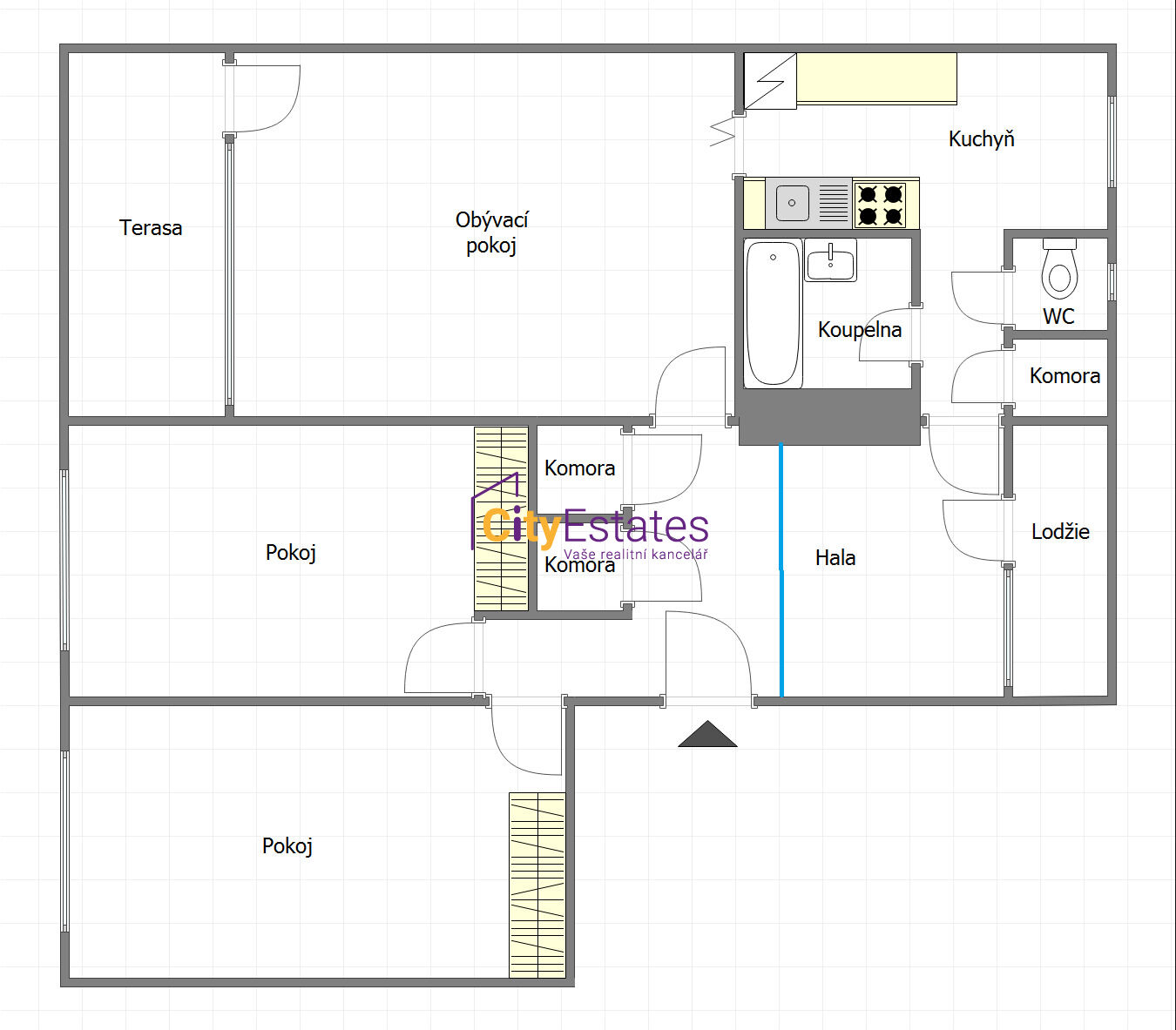 Aktuálně je byt upraven na nadstandartní 3+1 s velkou vstupní halou s posezením. Jednoduchým vybudováním sádrokartonové příčky je možno původní dispozici obnovit, dříve se u menší lodžie nacházela ložnice. V půdorysu modře naznačena původní příčka.