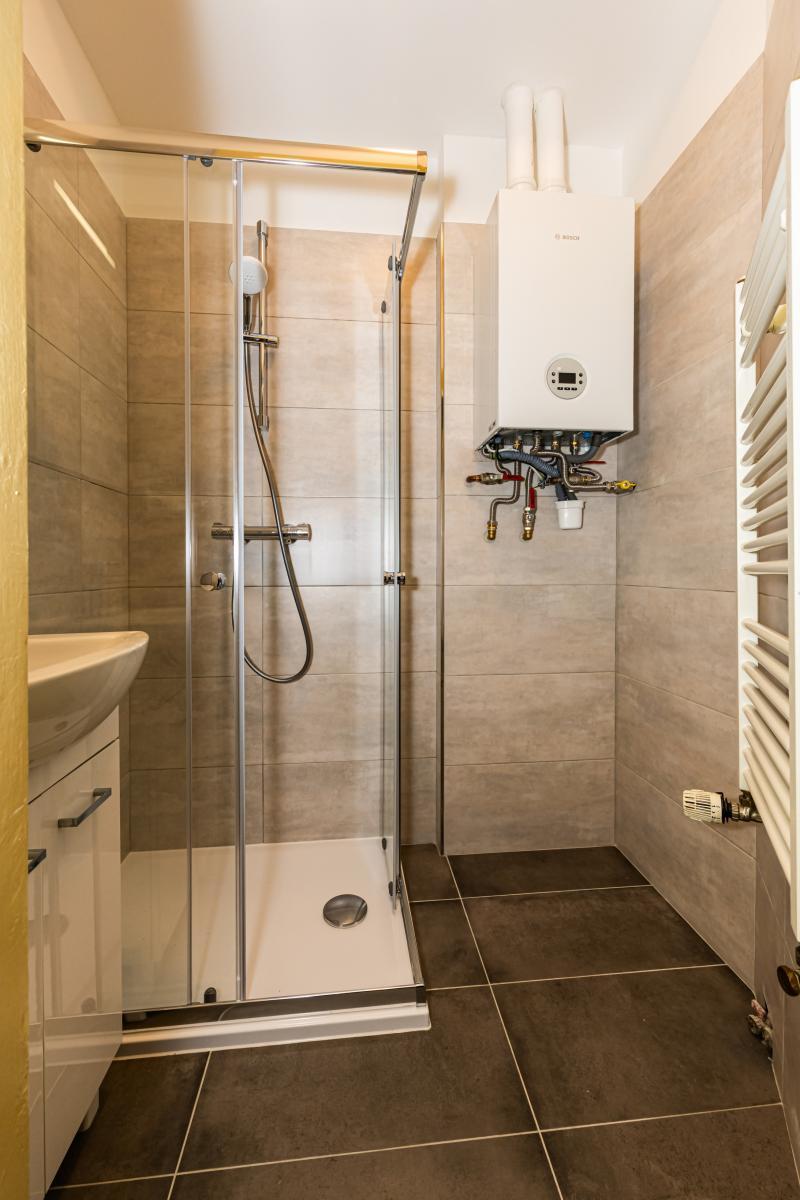 nová koupelna (sprchový kout, LED zrcadlo, nová dlažba, plynový kotel BOSCH)