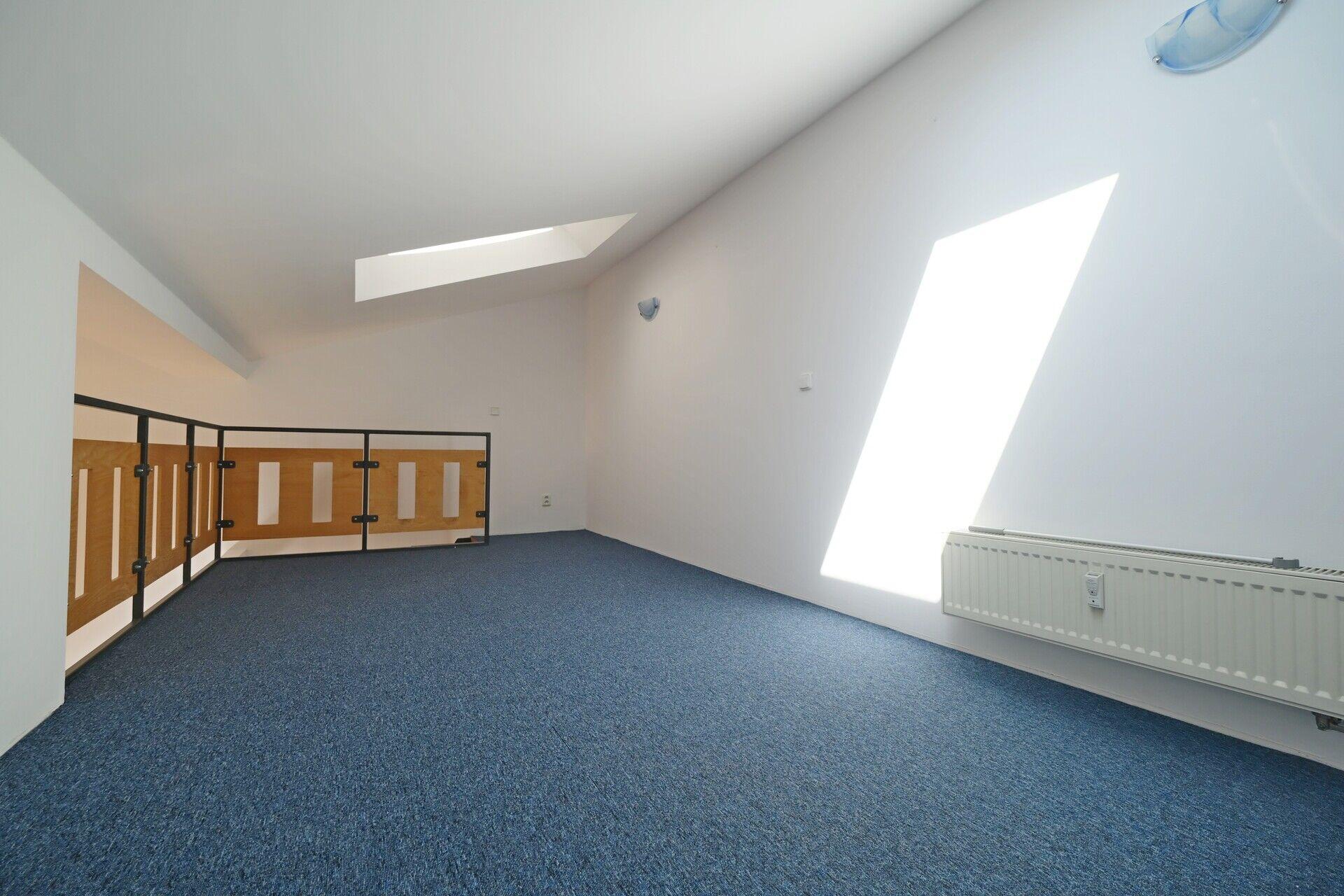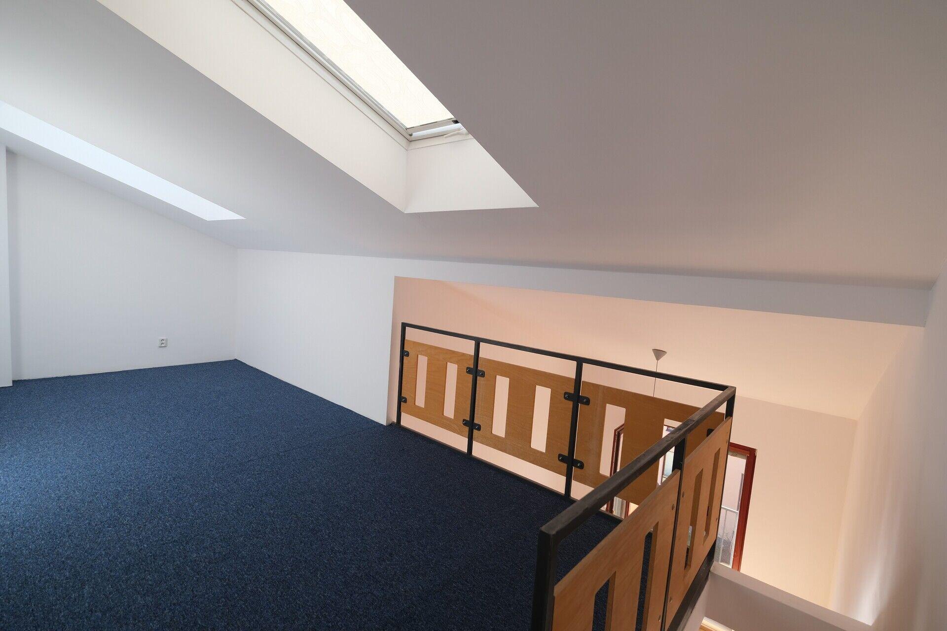 Z obývacího pokoje vedou schůdky na 1. patro, kde je rozlehlý prostor na spaní nebo ho lze využít jako velký úložný prostor.